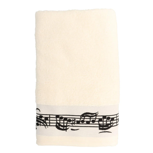 cremefarbenes Handtuch mit eingewebter Notenbordüre und Notenschlüssel in der Mitte