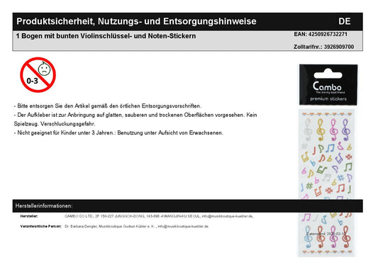 12 Bögen mit bunten Violinschlüssel- und Noten-Stickern