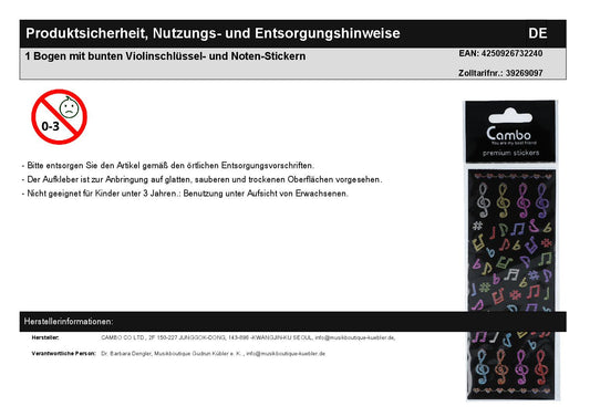 1 Bogen mit bunten Violinschlüssel- und Noten-Stickern