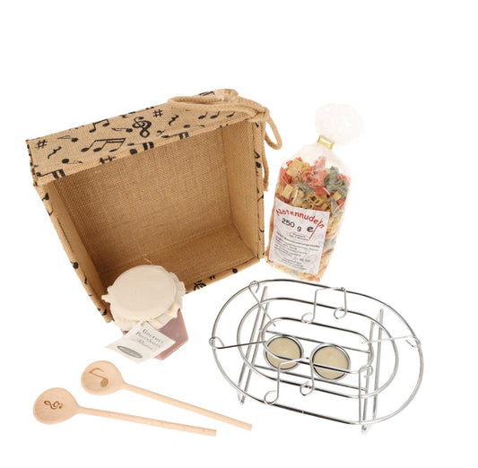 Geschenkbox mit Speisewärmer, Noten-Nudeln, Pastasauce und Mini-Kochlöffeln