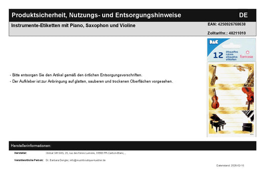 Instrumente-Etiketten mit Piano, Saxophon und Violine