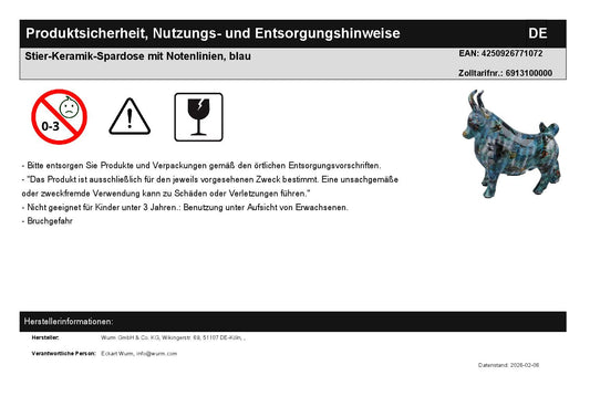 Taurus ceramic money box with music lines, blue