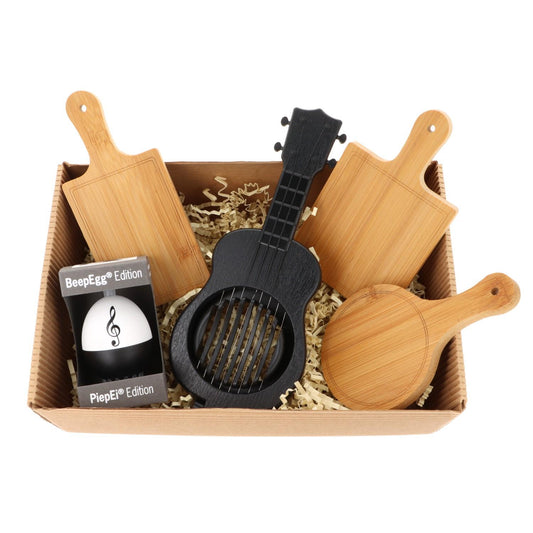 Geschenkset mit musikalischem PiepEi, Ukulele-Eierschneider und Mini-Brettchen in Faltschachtel