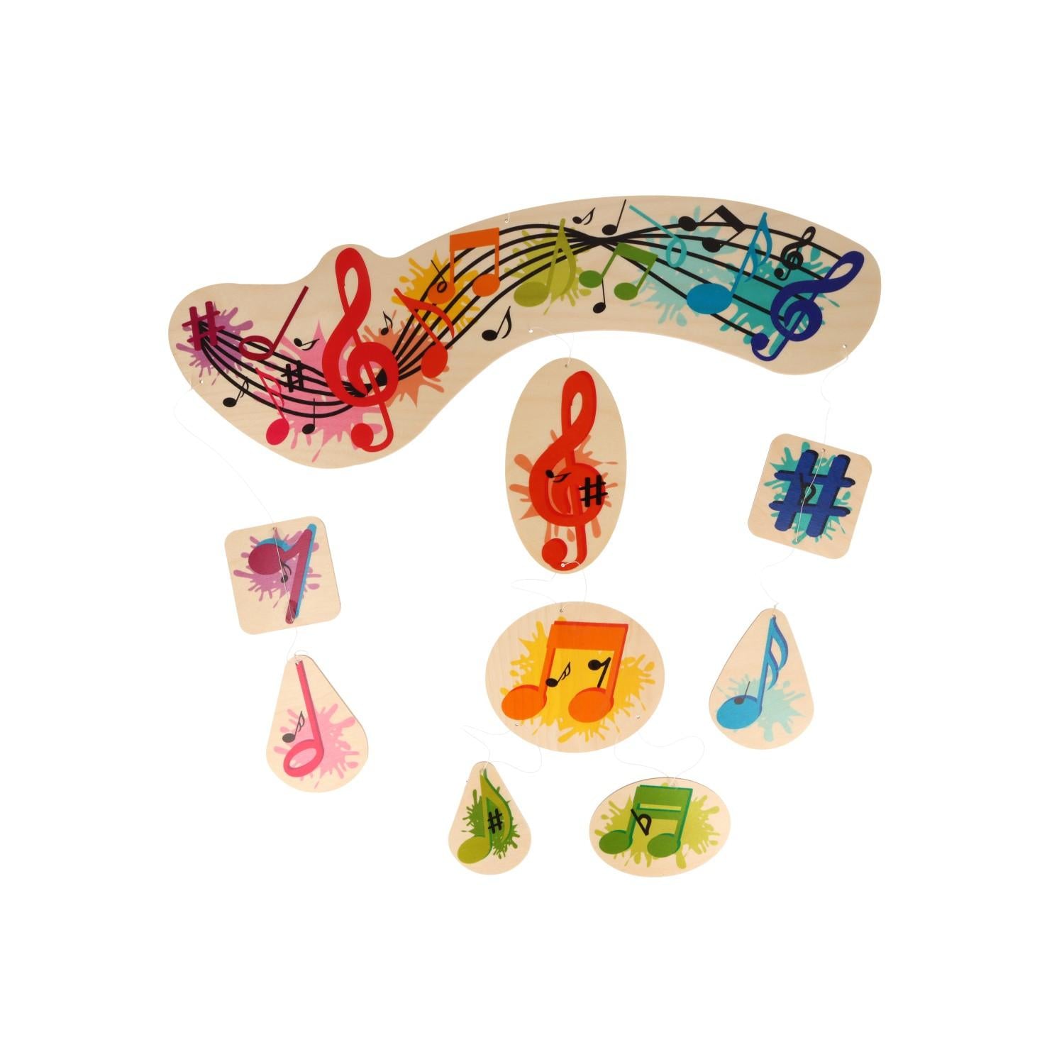 Wooden mobile, 9 pieces, printed on both sides. With colorful notes and treble clefs, this beautiful mobile is an eye-catcher in every child's room.