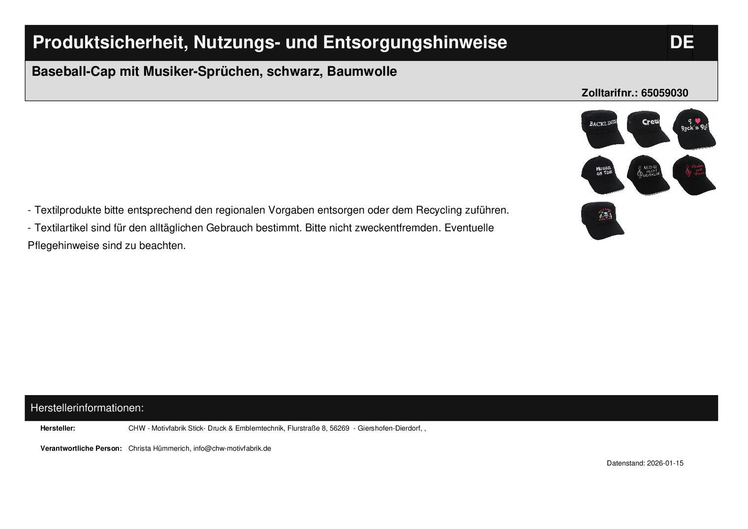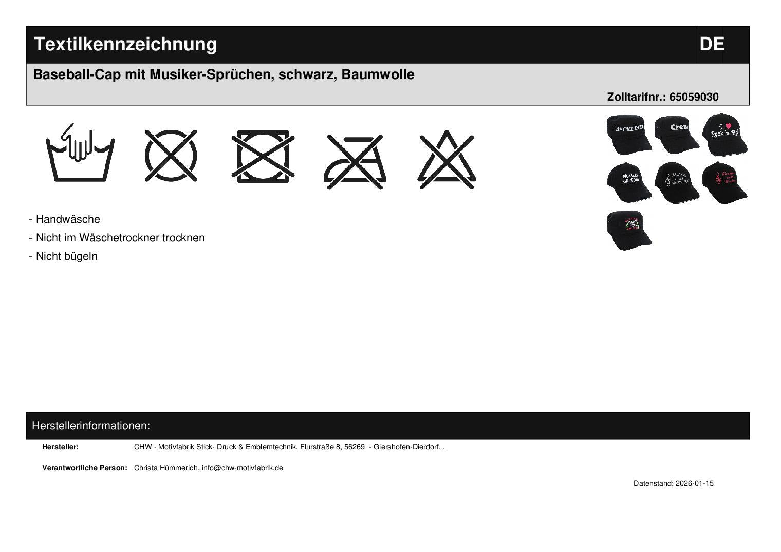 Baseball cap with musician sayings, black, cotton