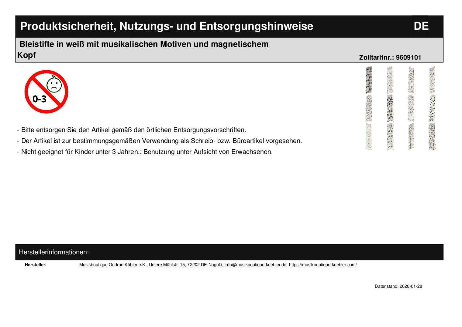 Pencils in white with musical motifs and magnetic head
