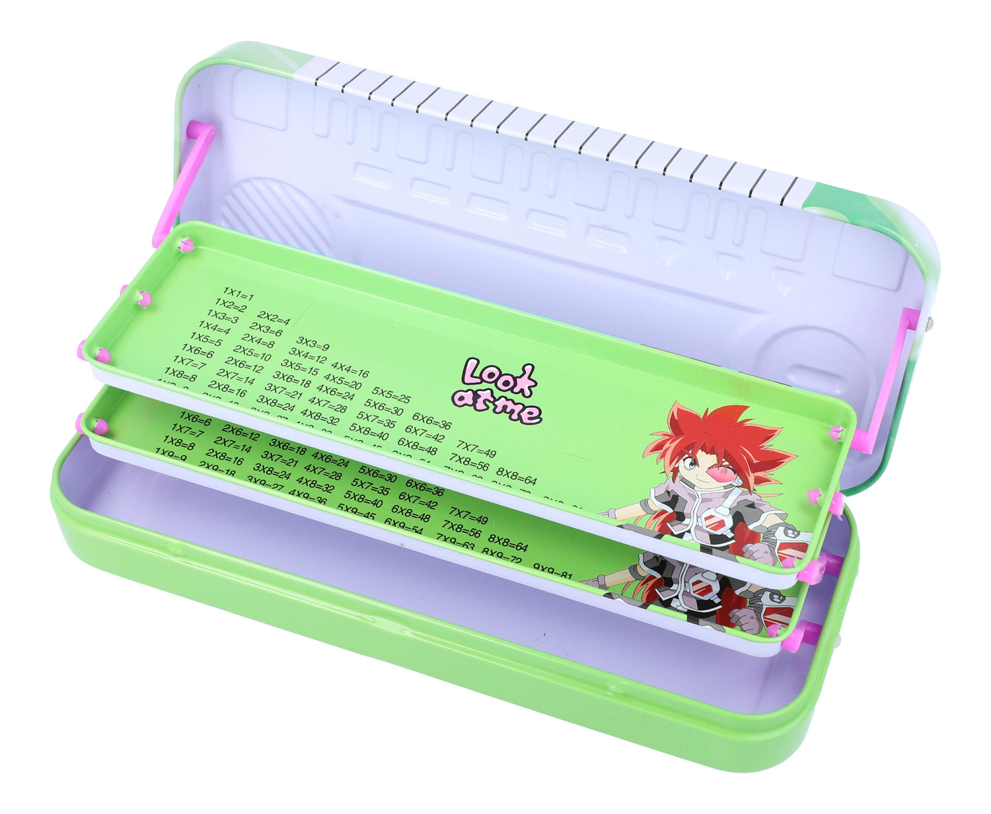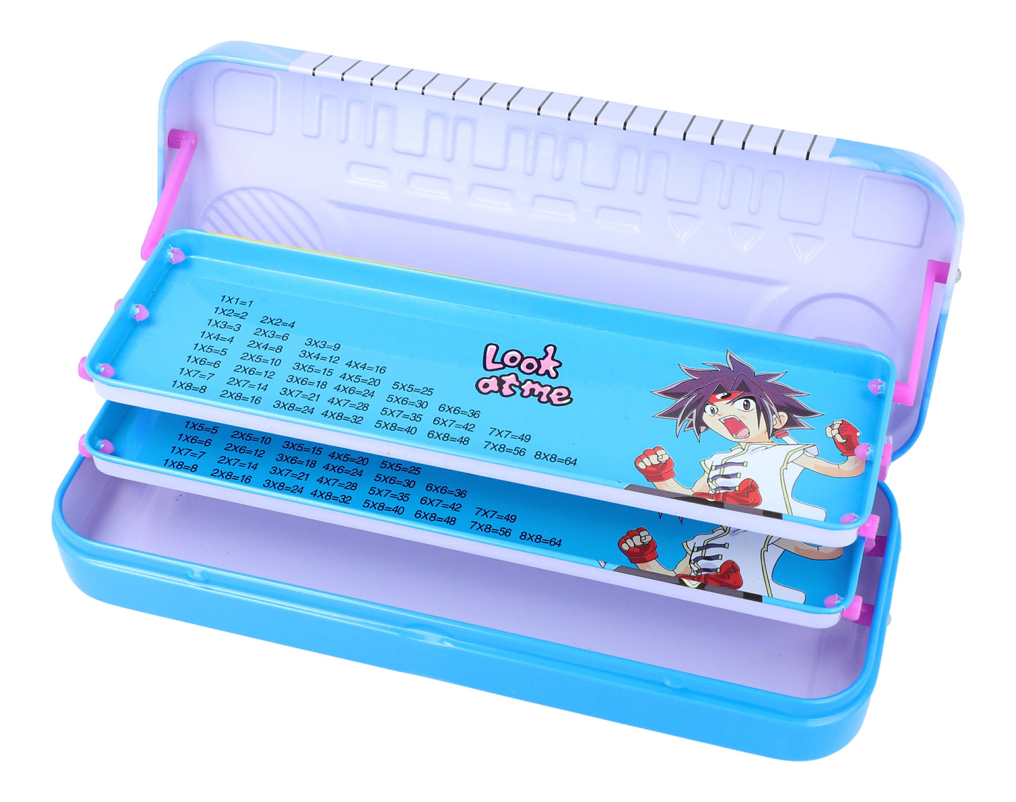 different colored pencil boxes with keyboard and other colorful "I love friends" motifs