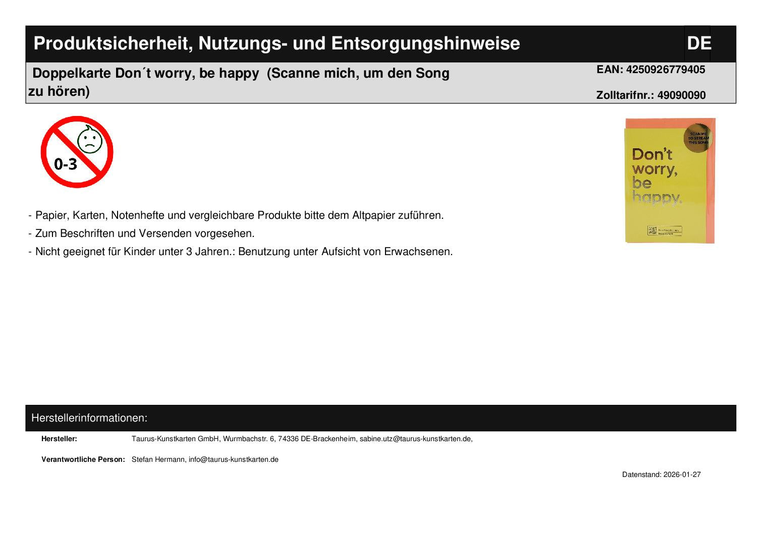 Double card Don´t worry, be happy (Scan me to hear the song)