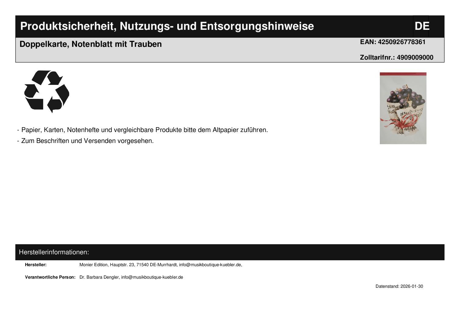 Double card, sheet music with grapes