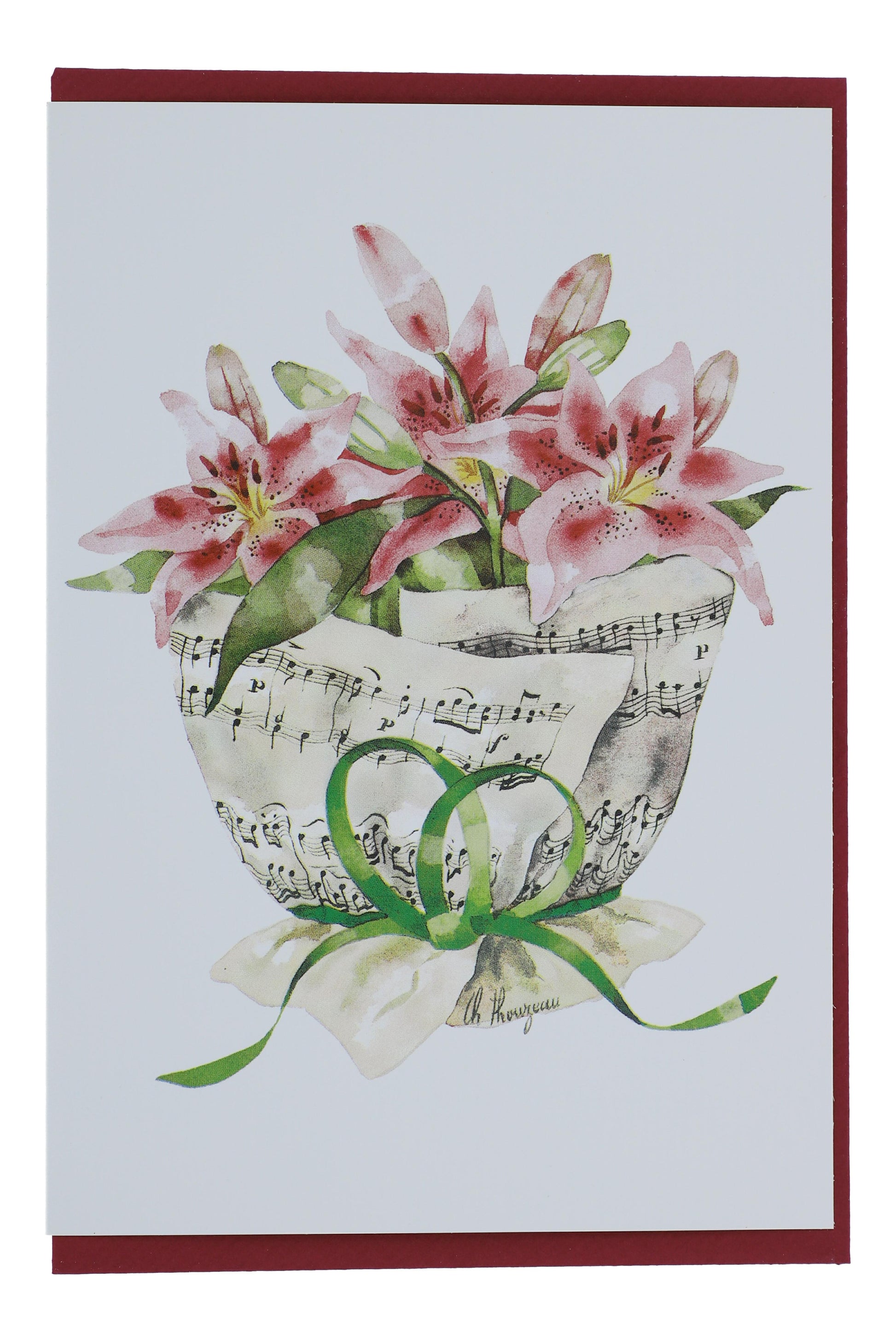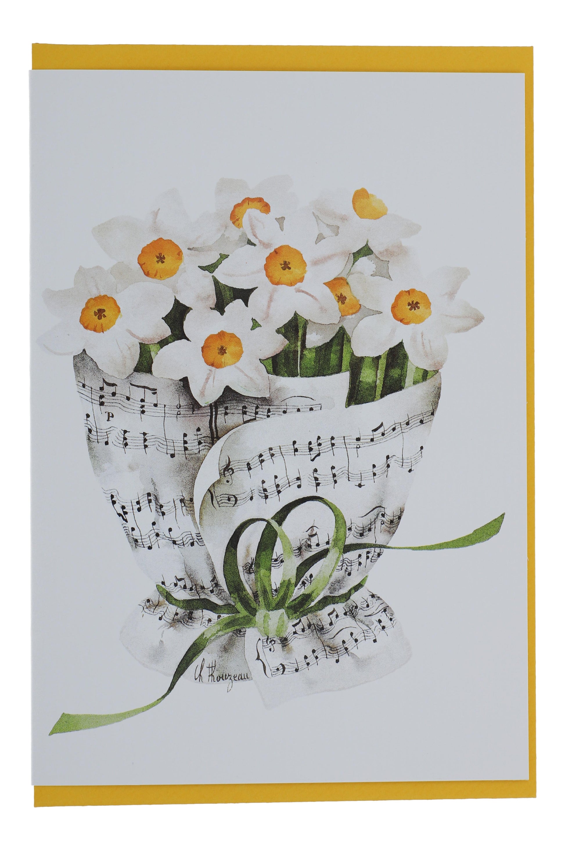 Various flowers from cyclamen to daisies to poinsettias, wrapped in music paper