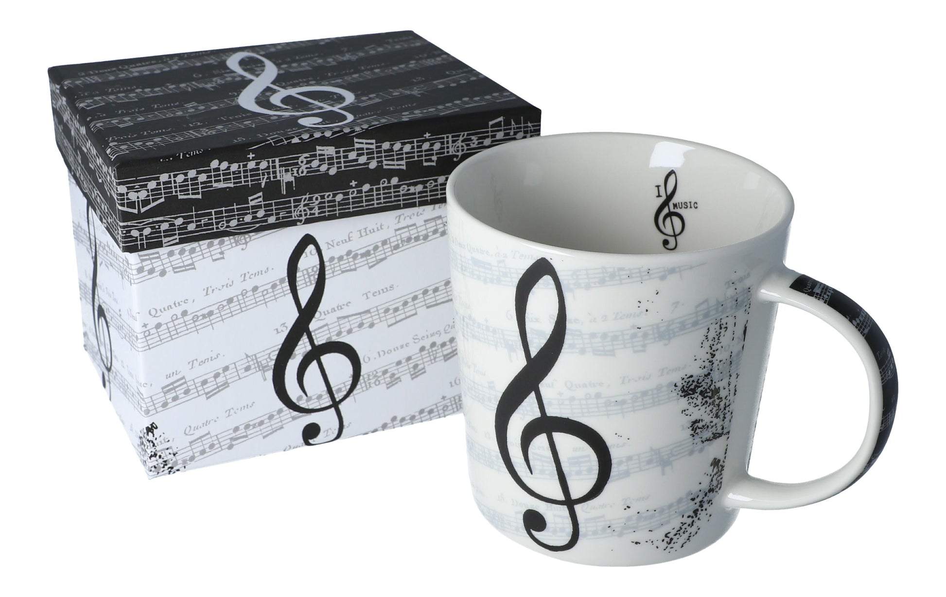 Large mug with black treble clef and grey music notes made of porcelain in a matching rectangular gift box.