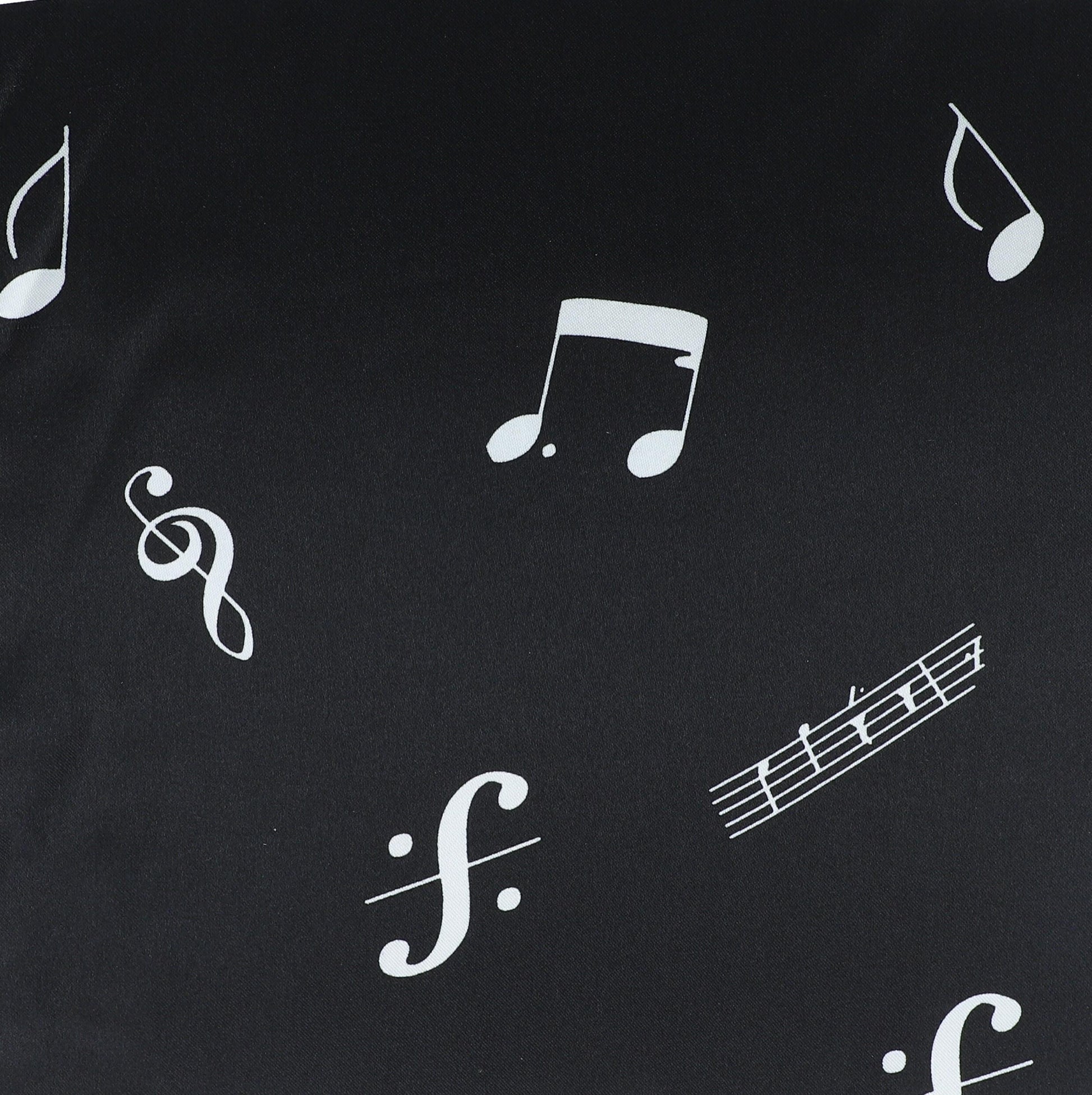 Black fabric by the meter with notes, clefs and staves, polyester satin