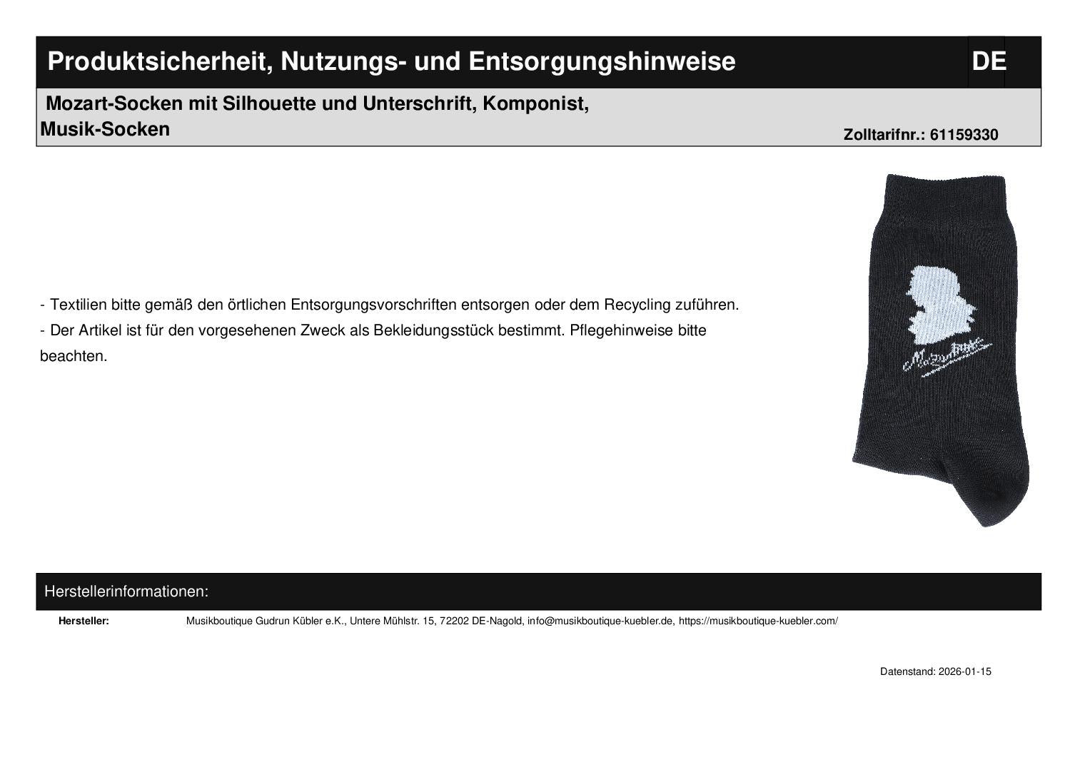 Sock base color black with woven Mozart silhouette and signature