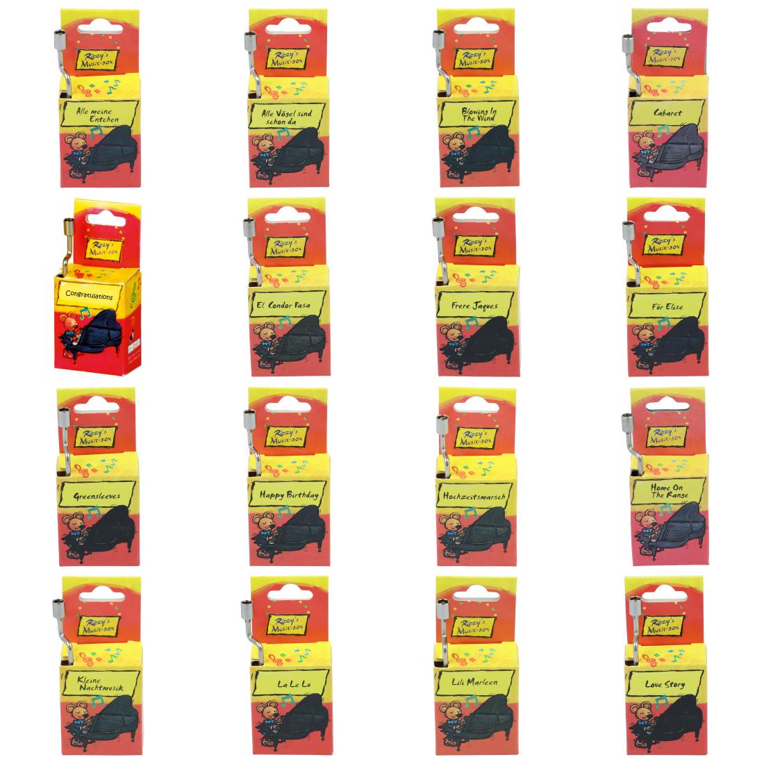 Rizzi music boxes with unforgettable melodies from all over the world, 41 melodies from "Alle meine Entchen" to "Für Elise" and "Happy birthday" to "Mozart's Magic Flute"