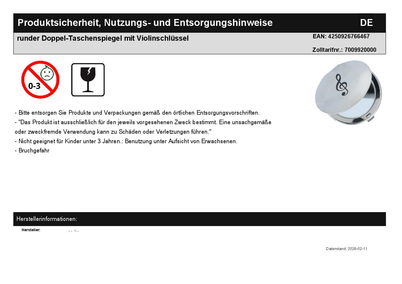 round double pocket mirror chrome, matt, printed with black treble clef