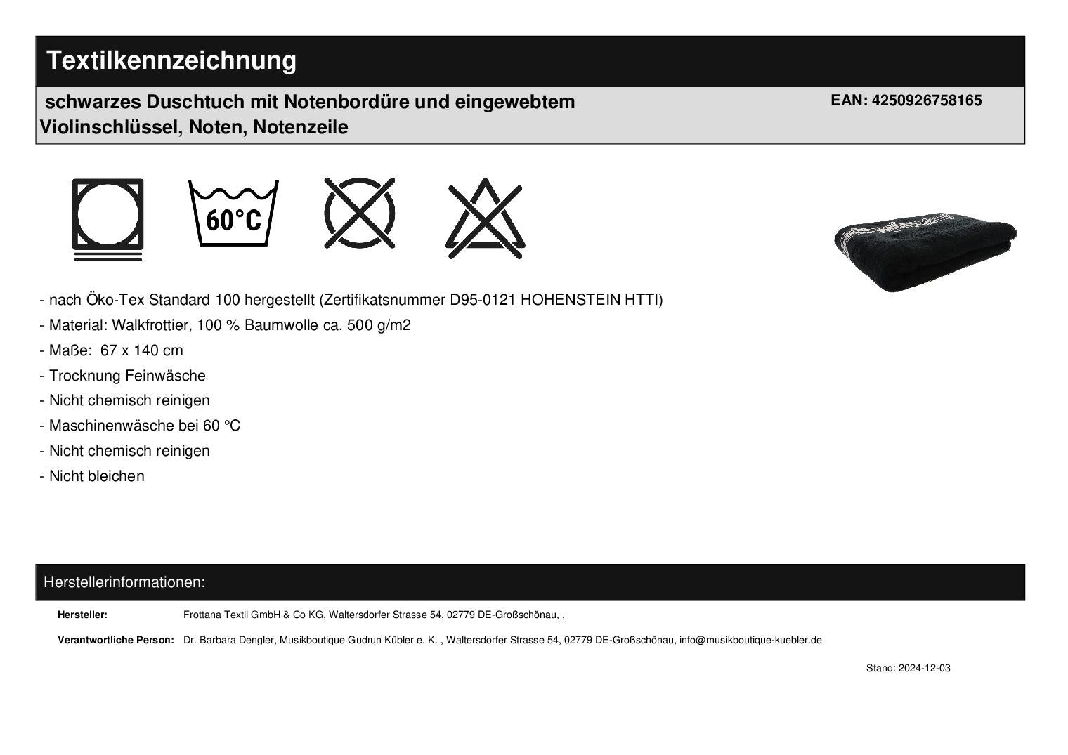 High-quality terry cloth in black with a woven silver music note border and a structured music clef woven high/low in the middle. Environmentally friendly and tested for harmful substances according to Oeko-Tex Standard 100 (certificate number D95-0121 HOHENSTEIN HTTI).