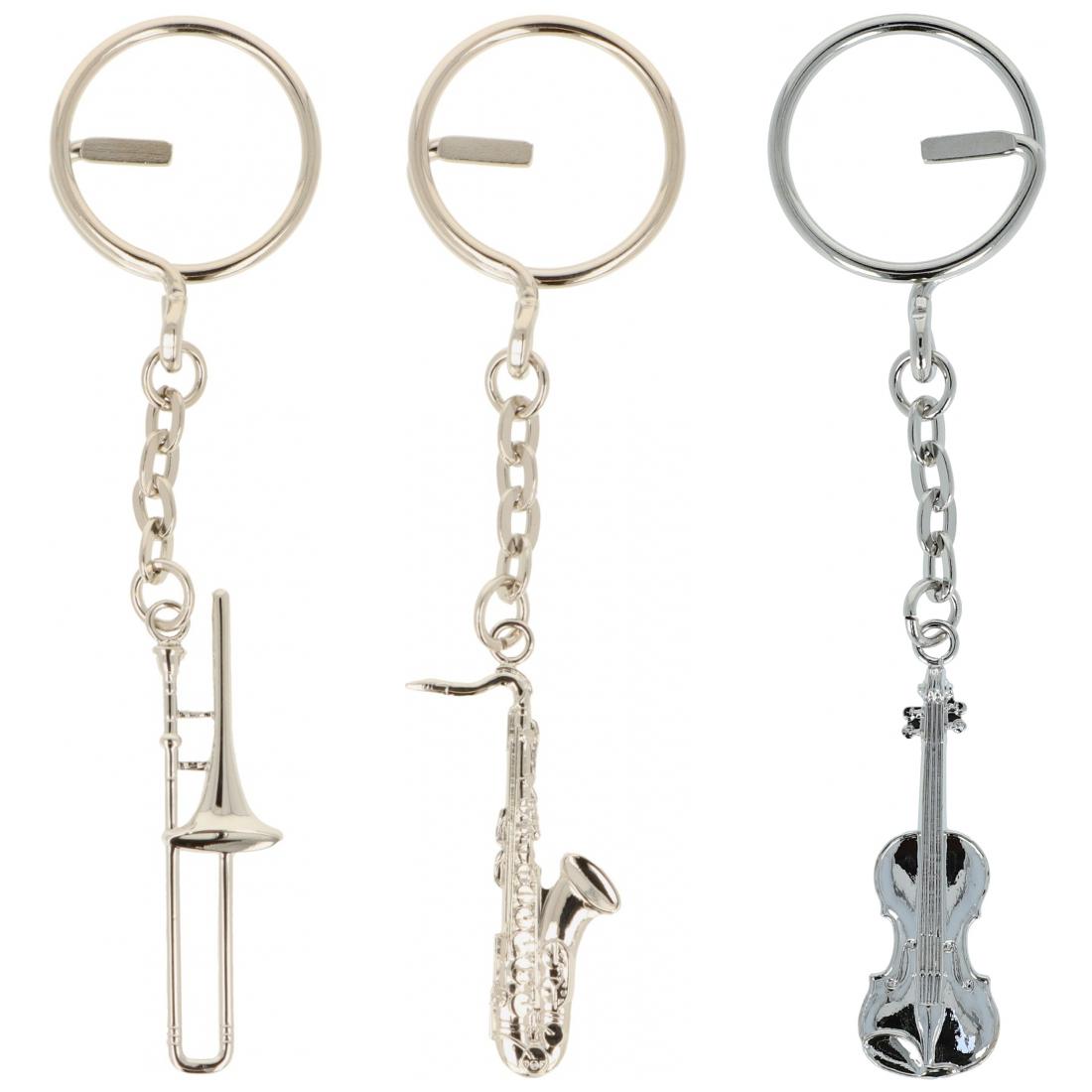 silver metal keychains shaped as instruments or treble clefs