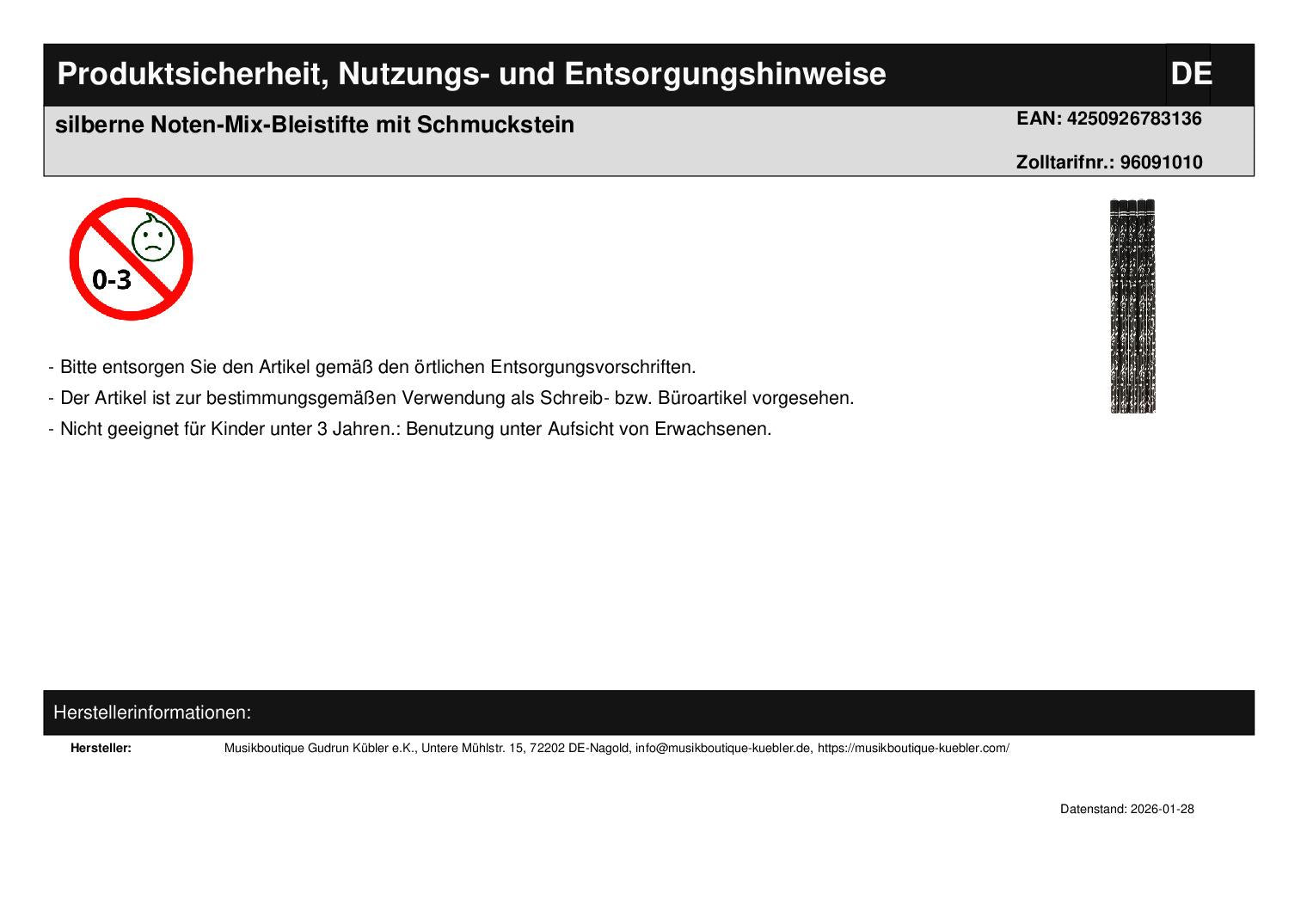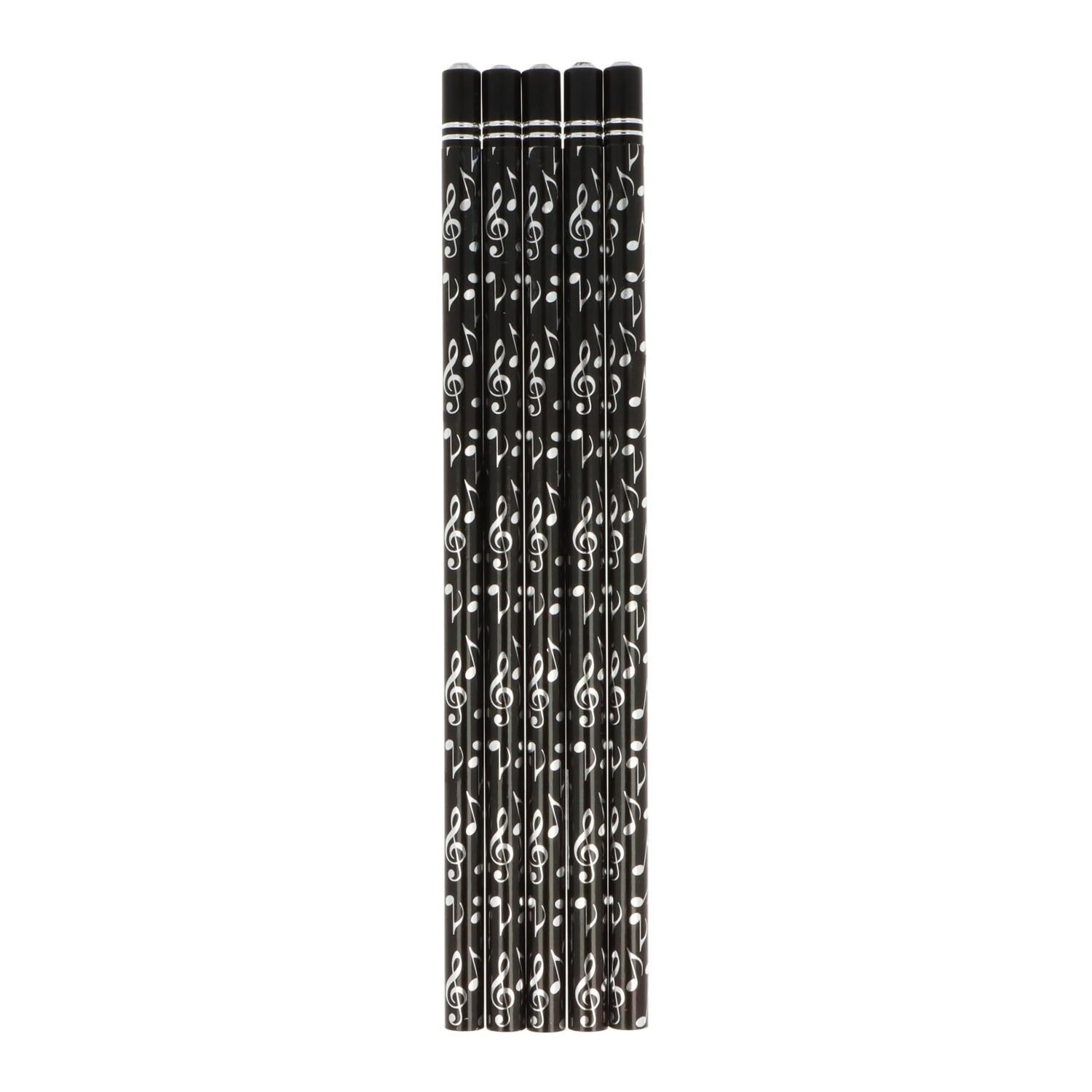 Pencils in black with shiny eighth notes and treble clefs in silver, finished with a decorative gemstone