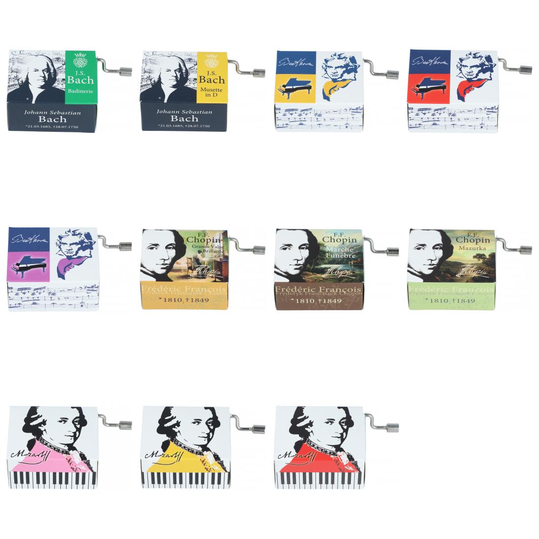Each music box features a composer motif as well as information about the respective composer and a matching melody from Bach, Beethoven, Chopin and Mozart
