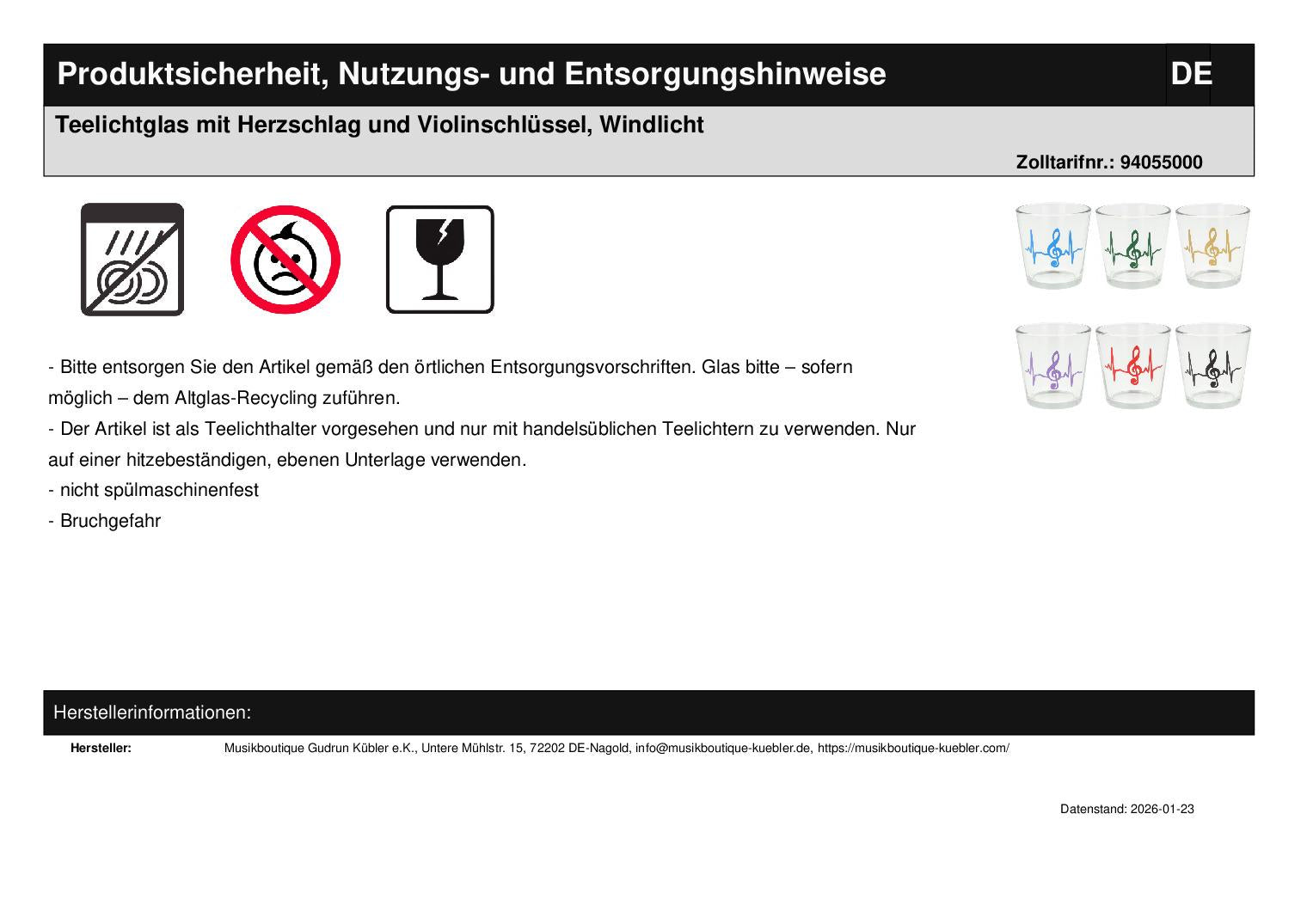 Teelichtglas mit Herzschlag und Violinschlüssel, Windlicht