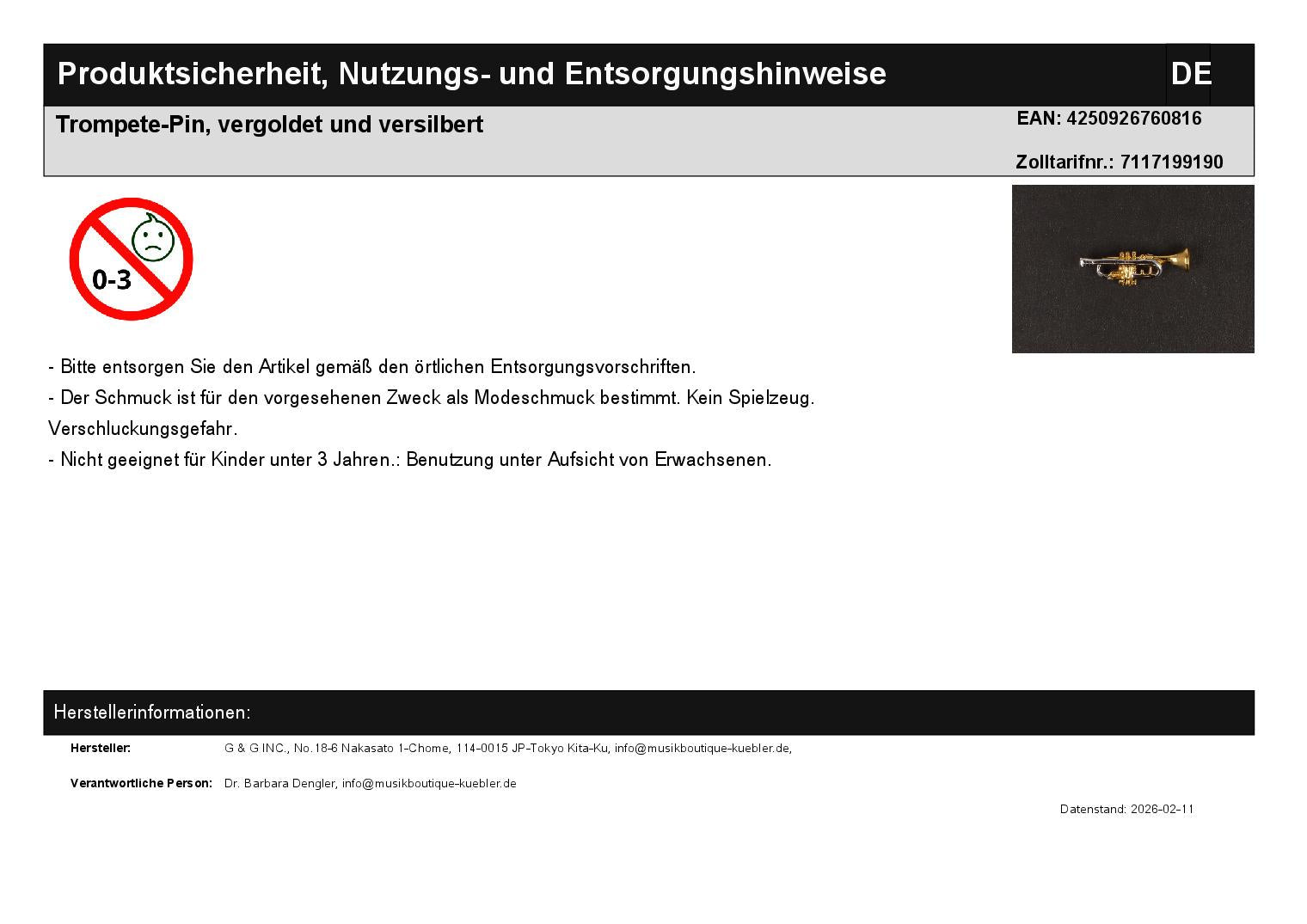 trumpet pin, gold-plated