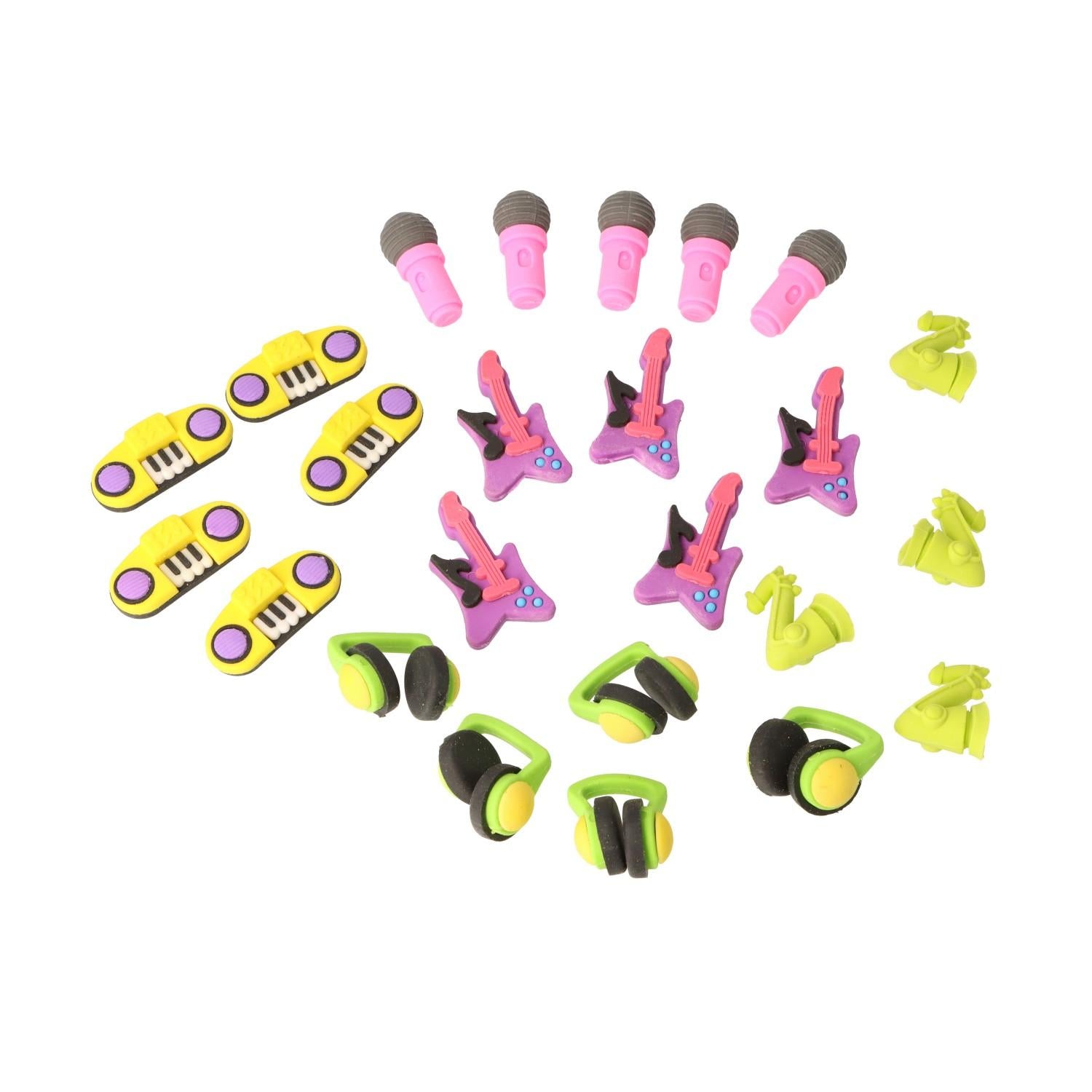 24-teilige geformte Radiergummis mit musikalischen Motiven, E-Gitarre, Mikrofon, Radio. Saxophon, Kopfhörer