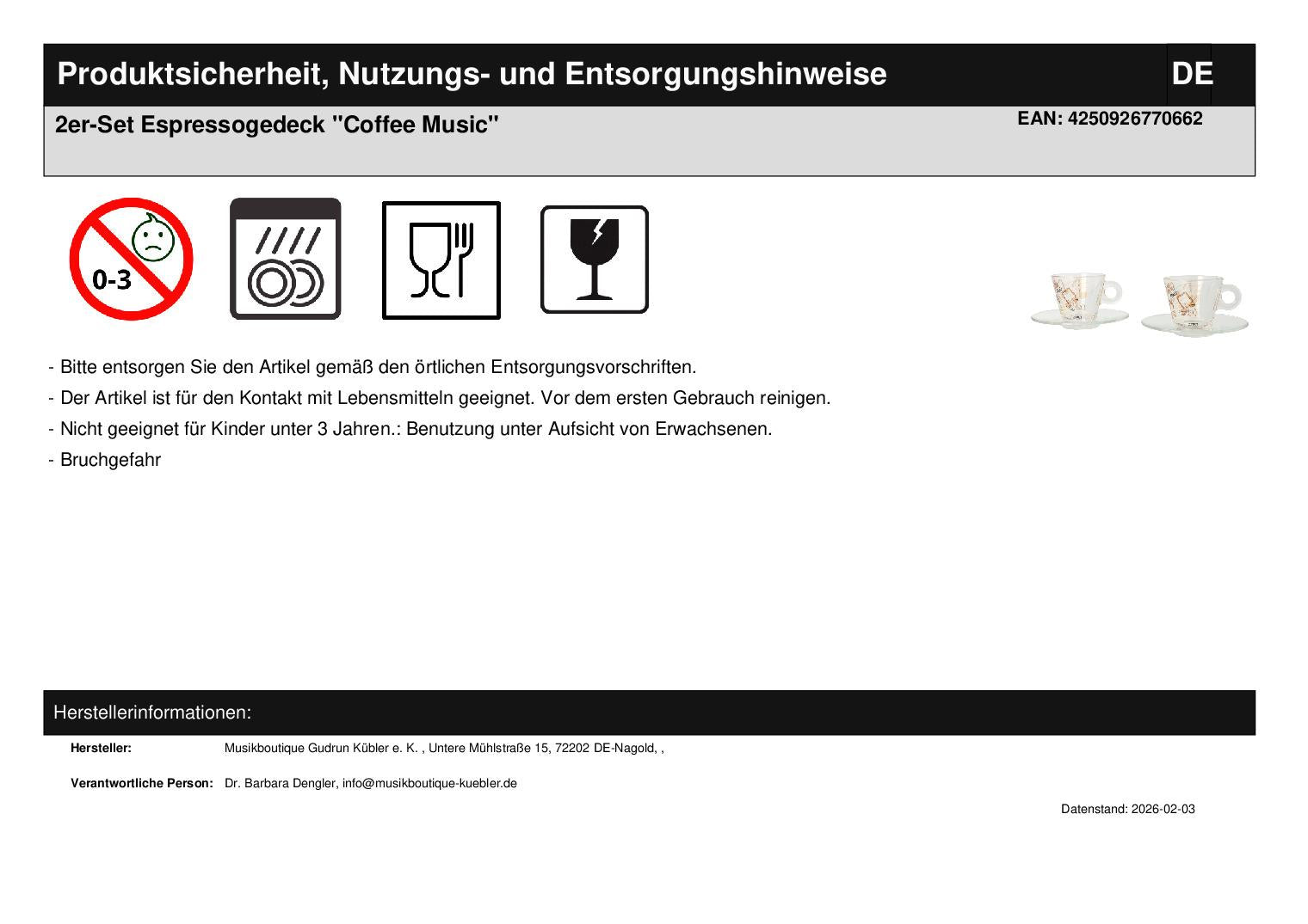 Esspressogedeck aus Glas mit Espresso-Tasse und -unterteller, bedruckt mit Noten, deren Köpfe Kaffeebohnen darstellen