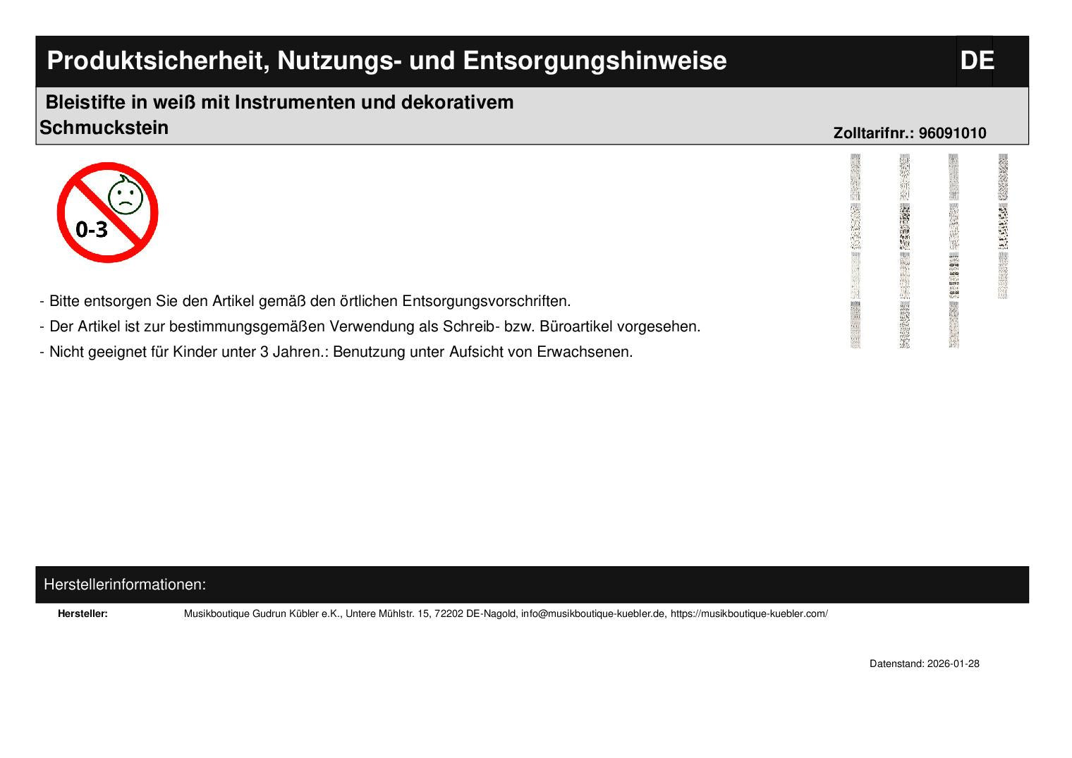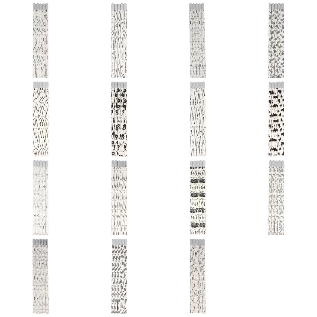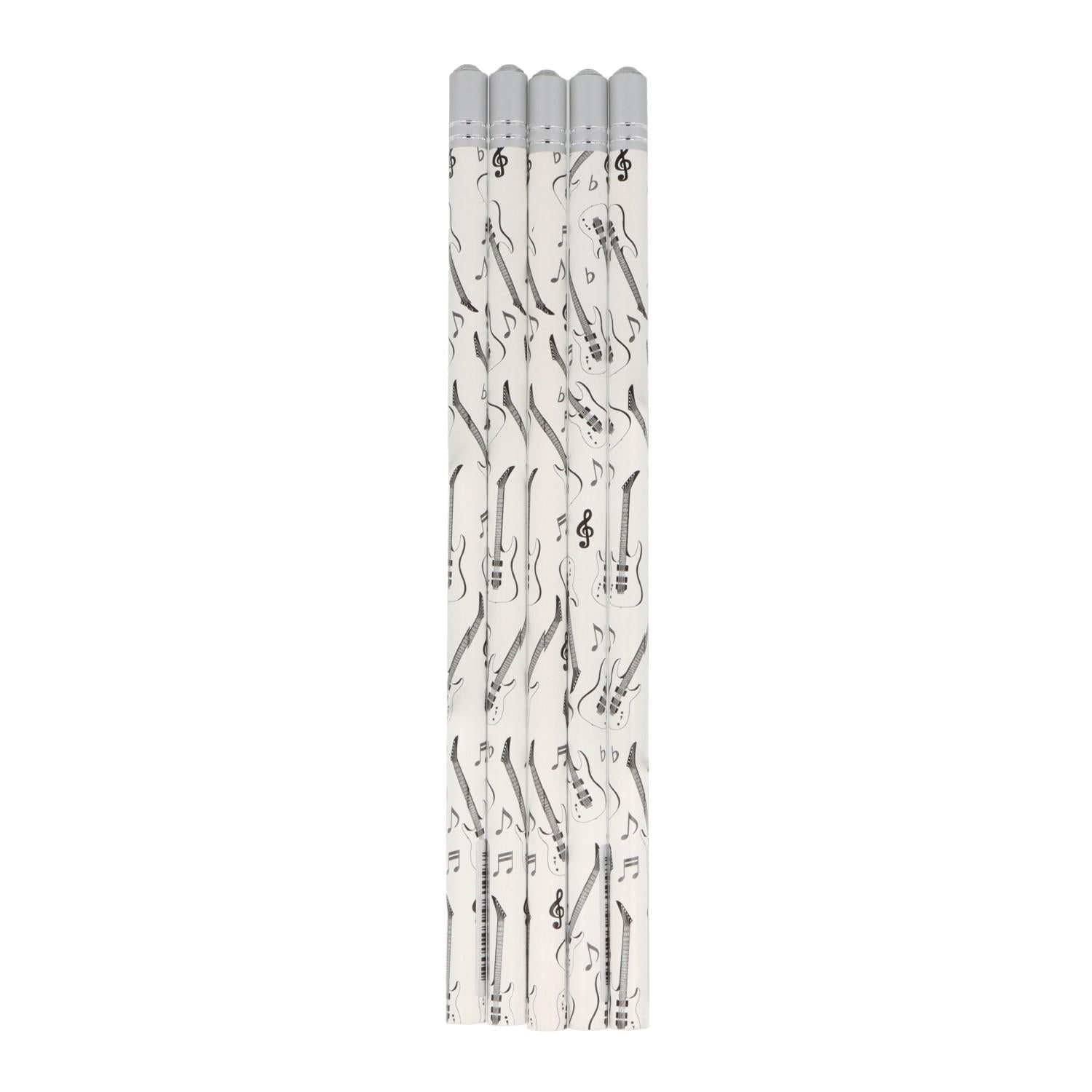 Bleistifte in weiß mit Instrumenten in schwarz von E-Gitarre bis Violine und dekorativem Schmuckstein