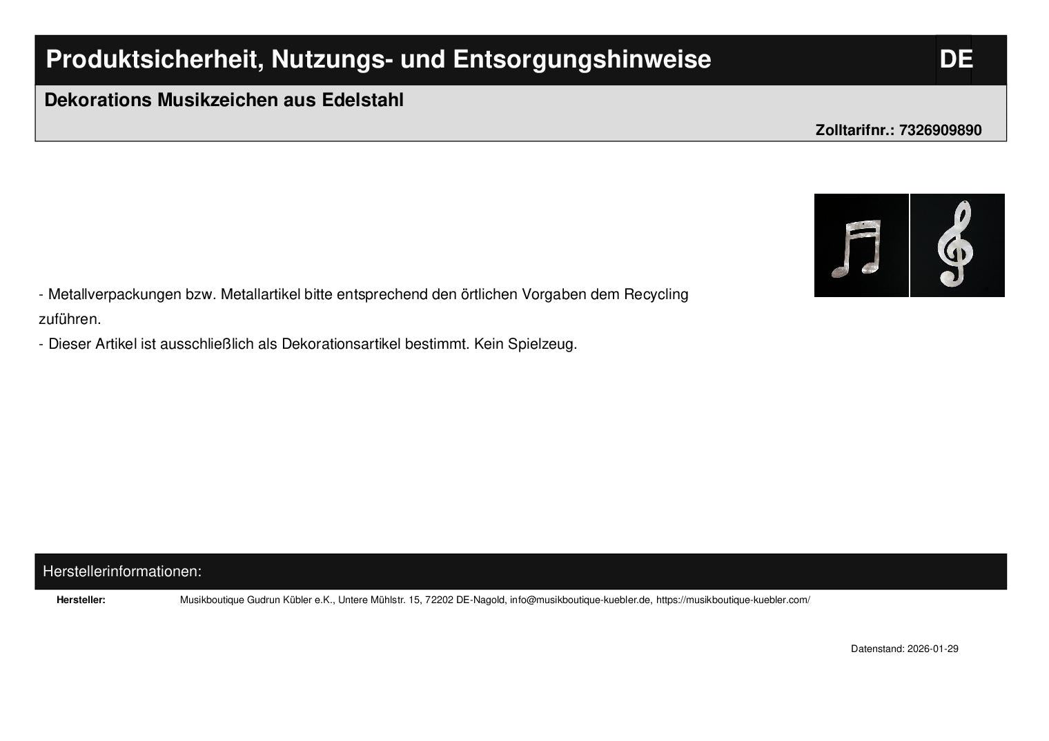 Dekorations Musikzeichen aus Edelstahl