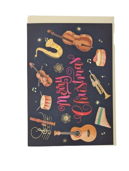 Merry Christmas mit verschiedenen Instrumenten, Konzertgitarre, Trompete, Violine, Cello, Trommel Saxophon, Blockflöte, Panflöte und Tamburin -goldenen Sternen