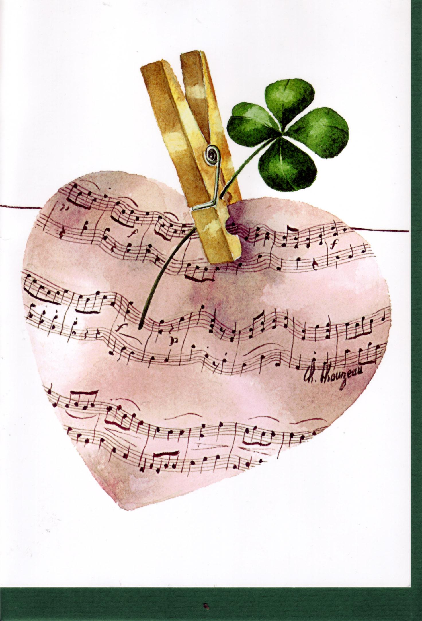 Herz mit Notenlinien, mit Klammer daran ein Kleeblatt geheftet