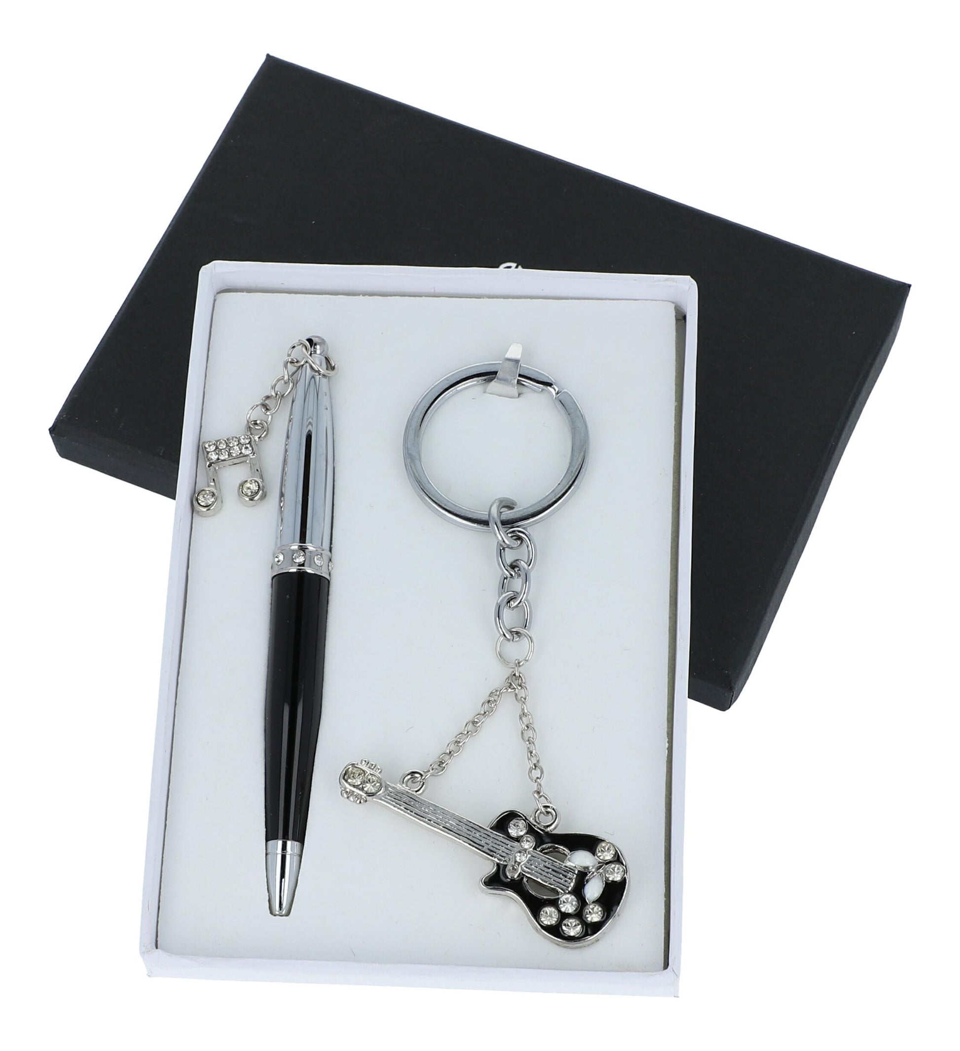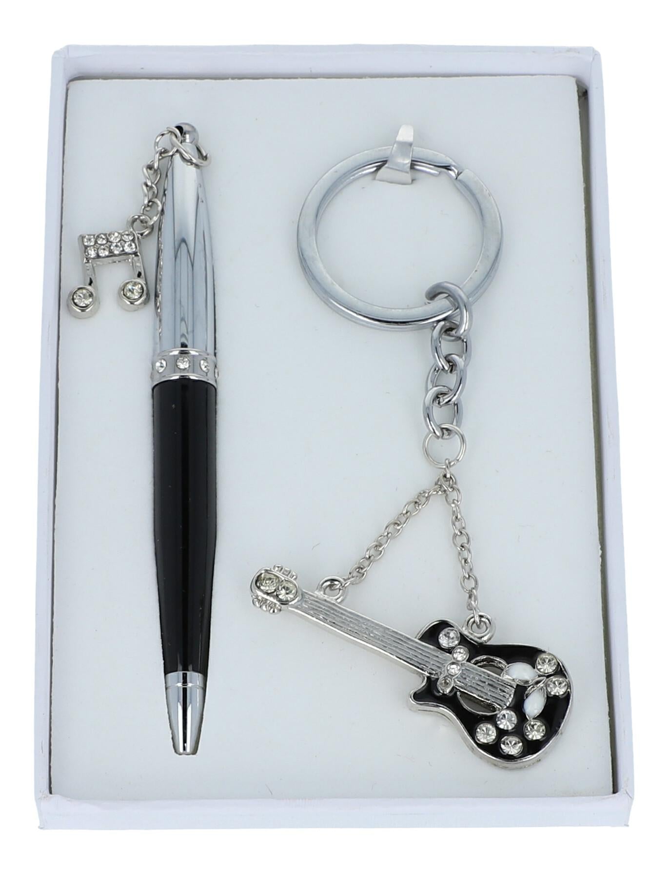 E-Gitarre-Schlüsselanhänger Set mit einem Kugelschreiber mit einem Schmucksteinen, in Geschenkbox. Der Schlüsselanhänger in Form einer E-Gitarre ist ein echter Blickfang und der Kugelschreiber mit dem Noten-Anhänger sorgt für musikalische Inspiration beim Schreiben.