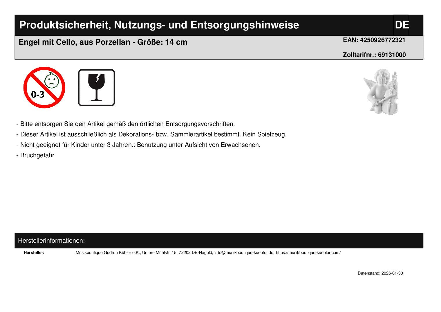 Engel mit Cello, aus Porzellan - Größe: 14 cm