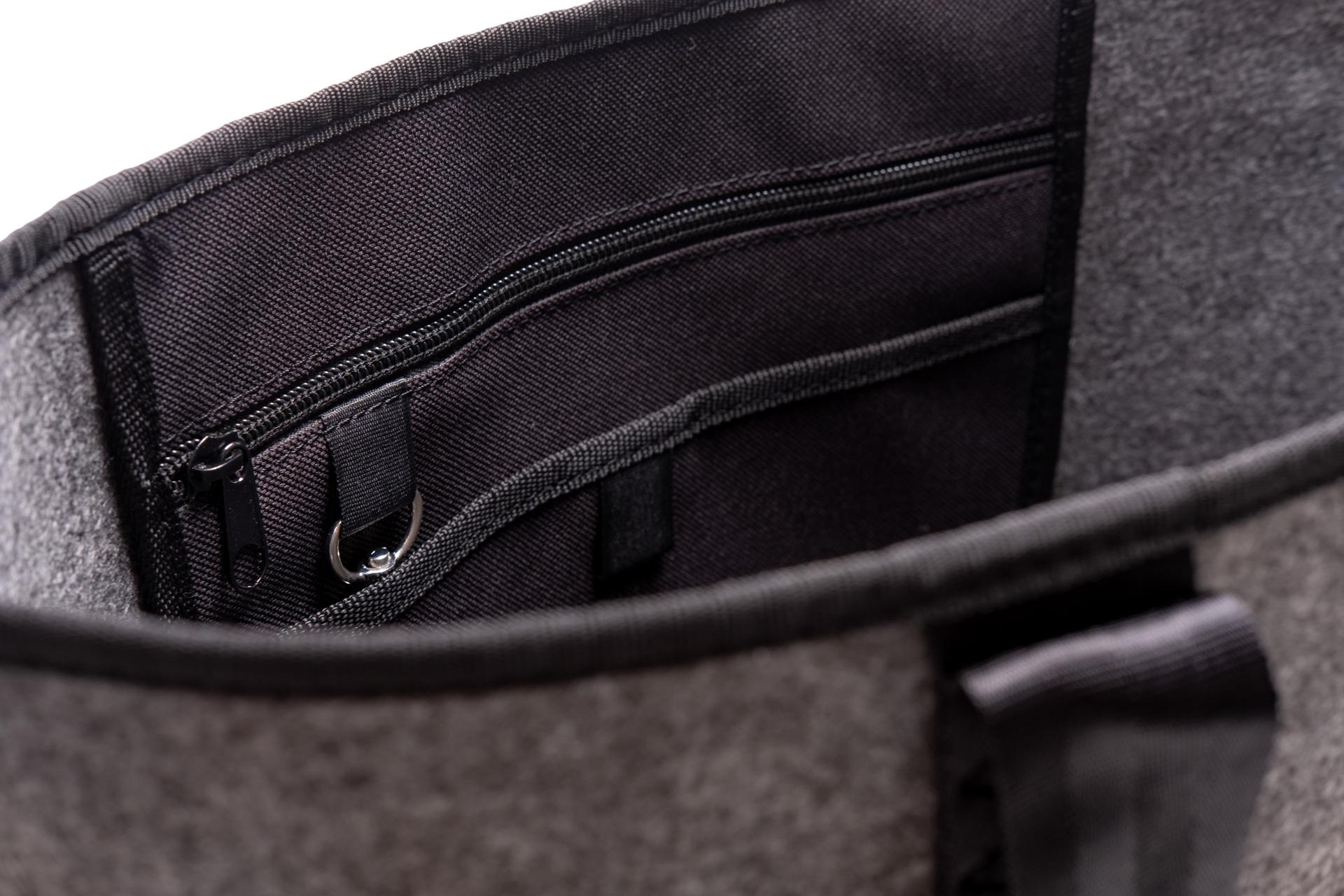 Reißverschluss, mit zusätzlicher Innentasche, inklusive 2 Fächern mit Reißverschluss und Klettverschluss sowie an einem Band befestigter Karabinerhaken.