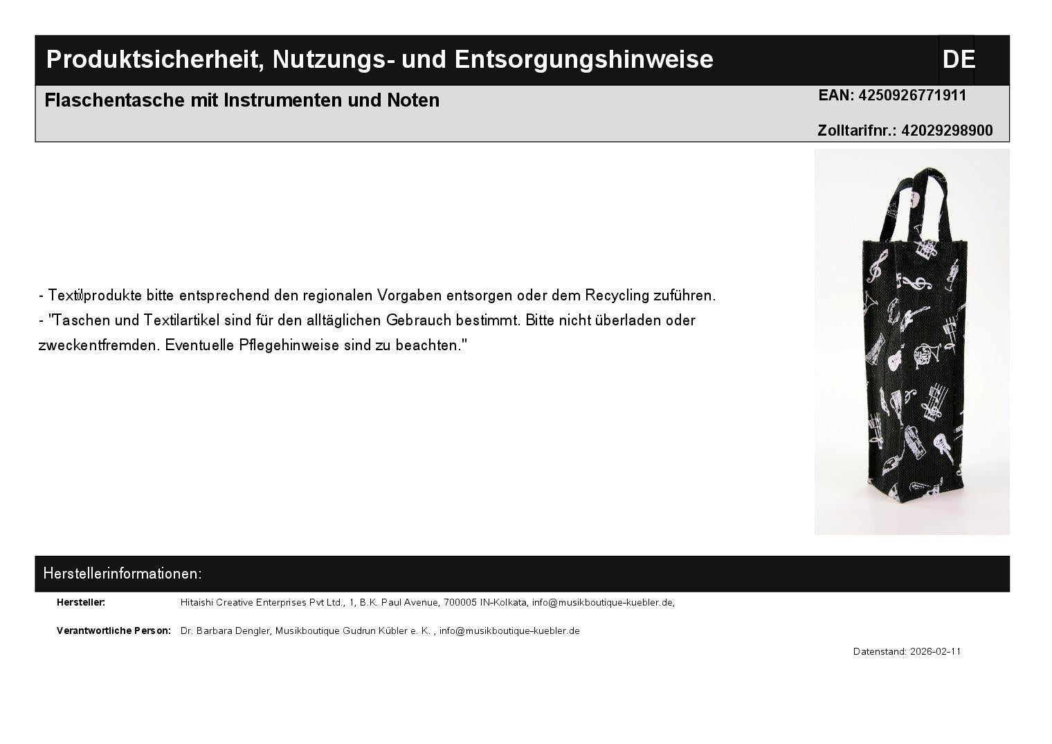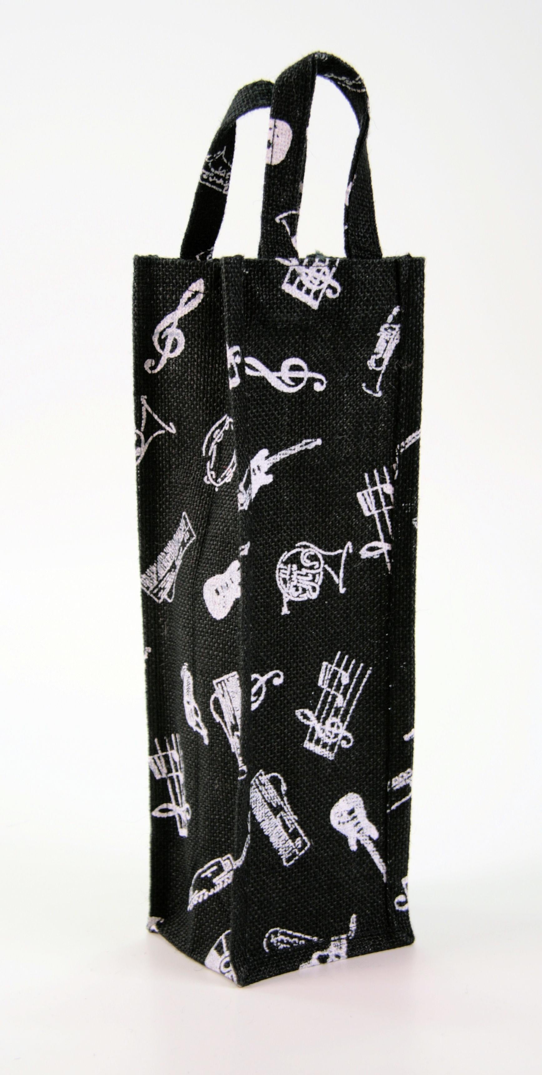 schwarze Flaschentasche aus Juteleinen mit weiß eingewebten Instrumenten und Noten