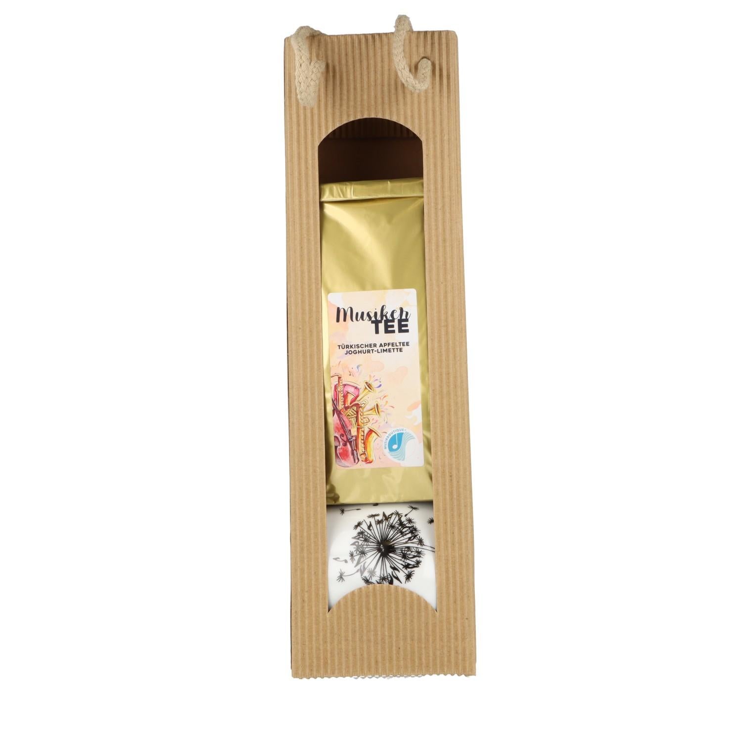 Geschenkset Kuschelbecher Pusteblume mit Noten, Teesieb, Deckel und Musikertee in Tragetasche Welle natur