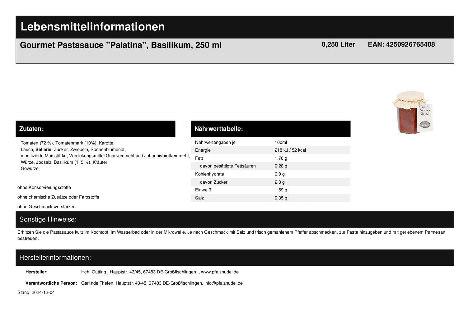 - Pastasauce Basilikum, 250 ml