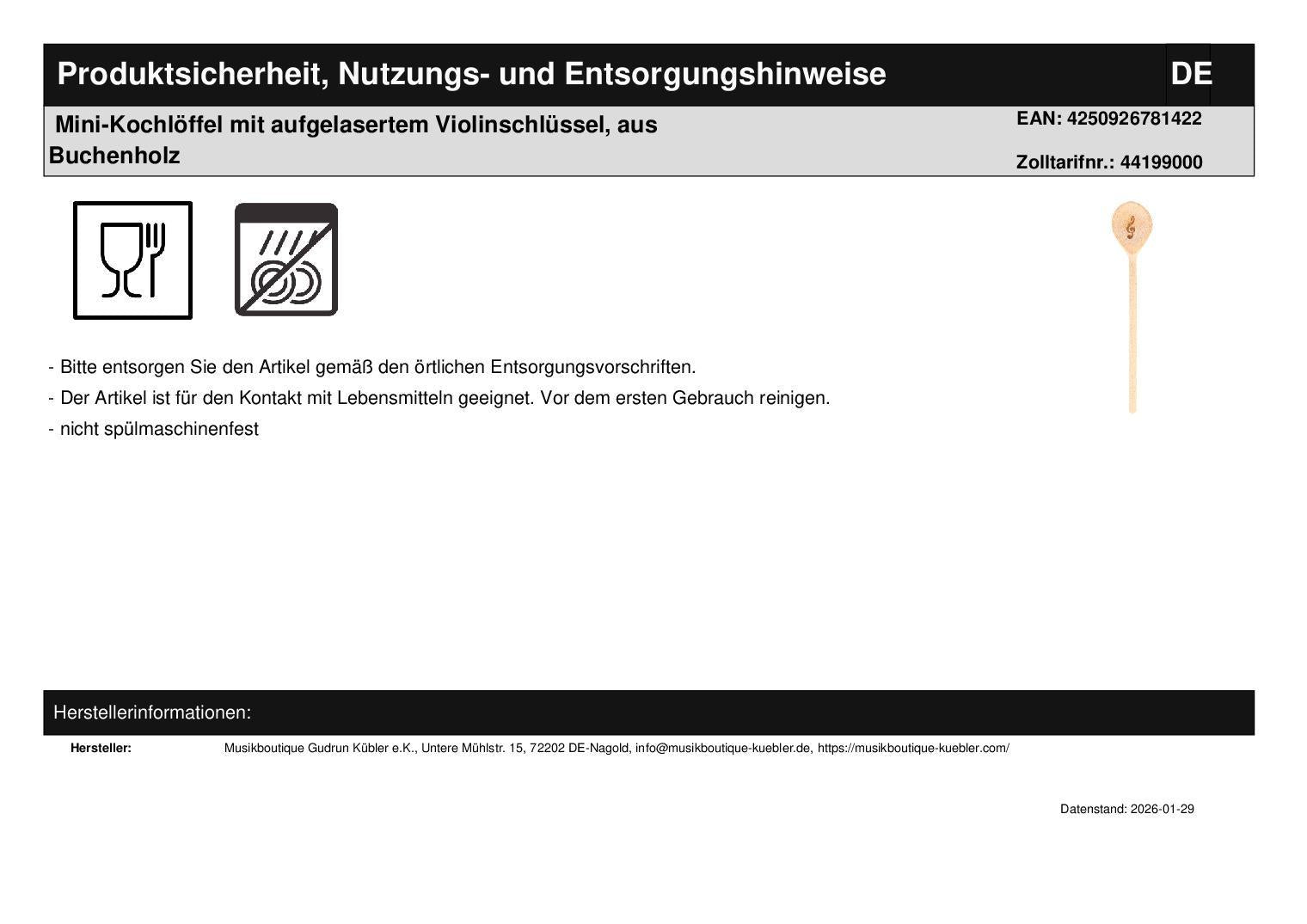 1 x Mini-Kochlöffel mit aufgelasertem Violinschlüssel, aus Buchenholz naturbelassen