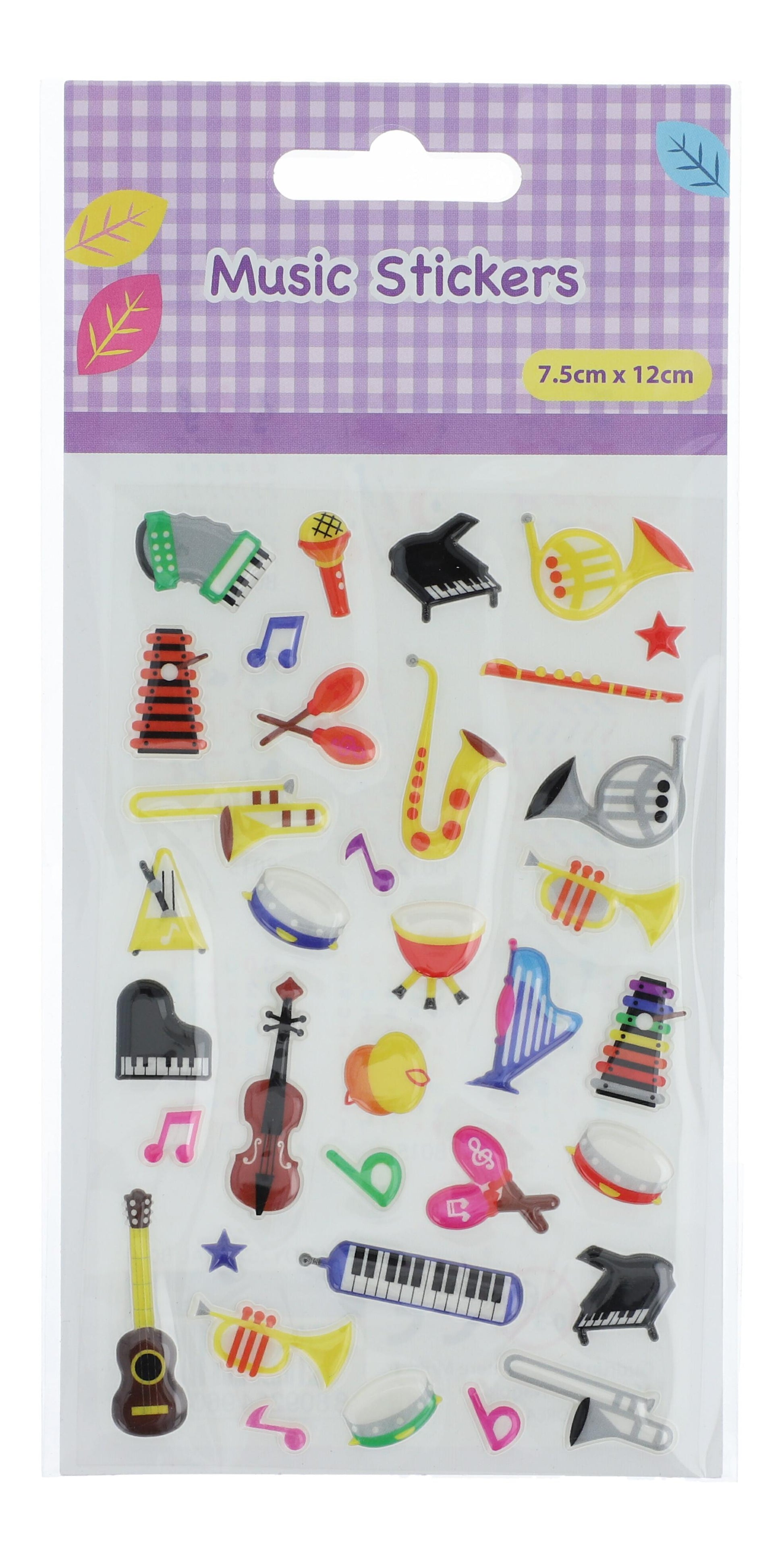 Sticker mit bunten Noten und Instrumenten wie z. B. Horn, Akkordeon, Saxophon, Violine, Flügel