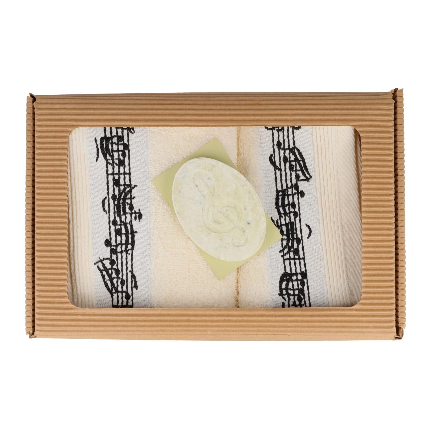 Schönes Geschenkset für Wohlfühlmomente im Bad: bestehend aus cremefarbenem Gästehandtuch, Waschhandschuh mit Notenbordüre und Salzseife Limette mit eingeprägtem Violinschlüssel. Verpackt im Geschenkkarton mit Sichtfenster.