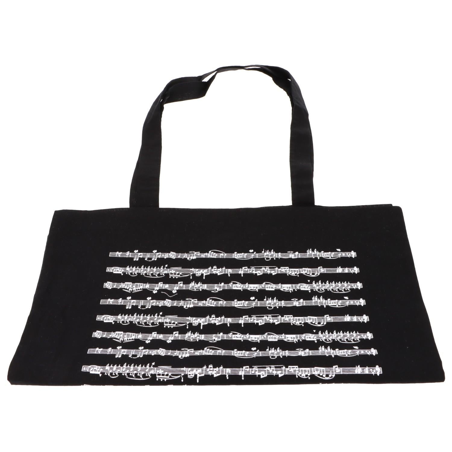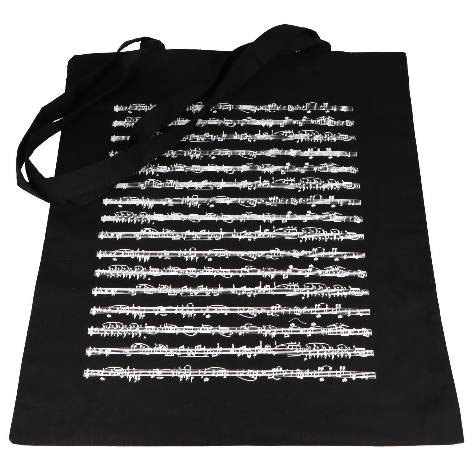 schwarze Henkeltasche beidseitig bedruckt mit weißen Notenlinien