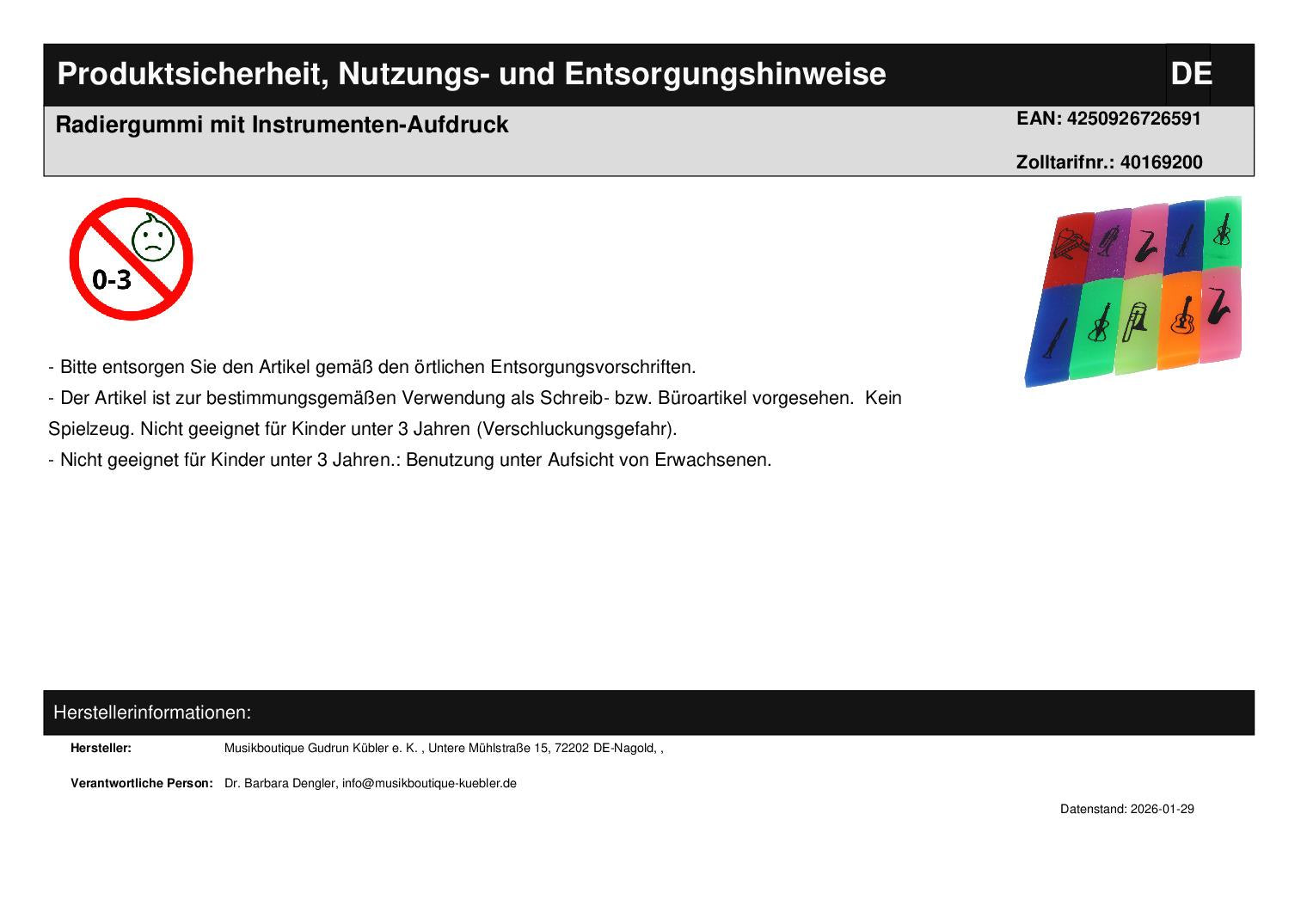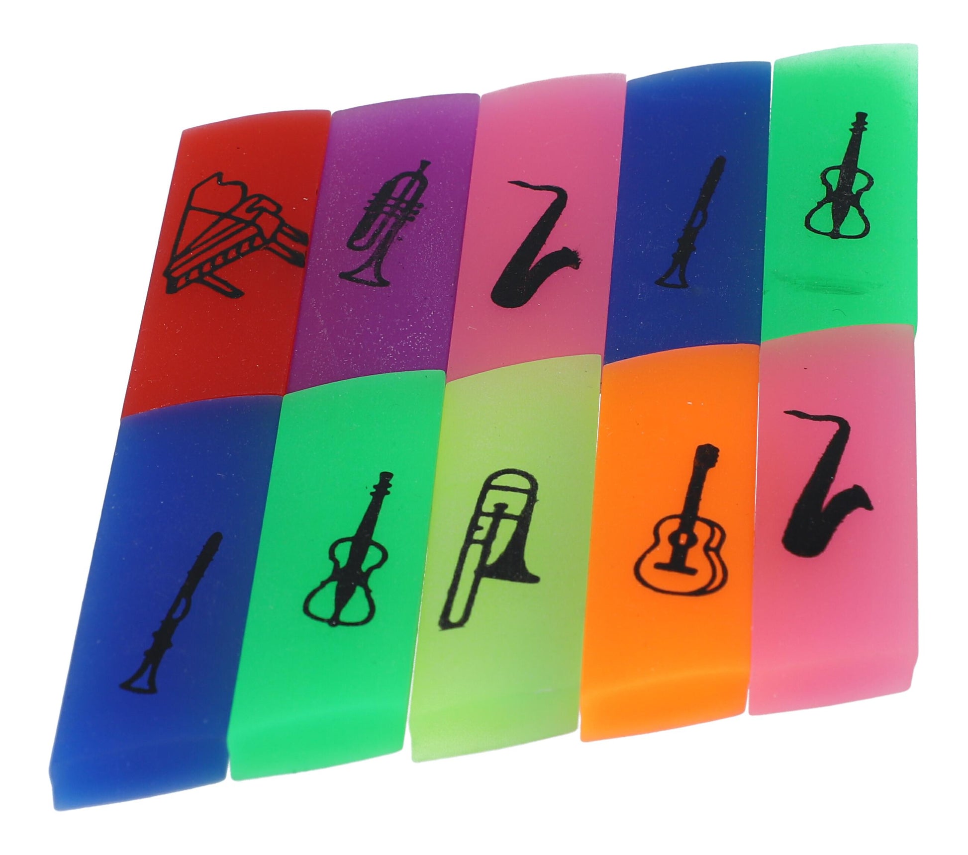 bunte Radiergummis mit Instrumenten-Aufdruck. Die verschiedene Instrumenten machen den Radiergummi zu einem coolen Accessoire für Musikliebhaber.