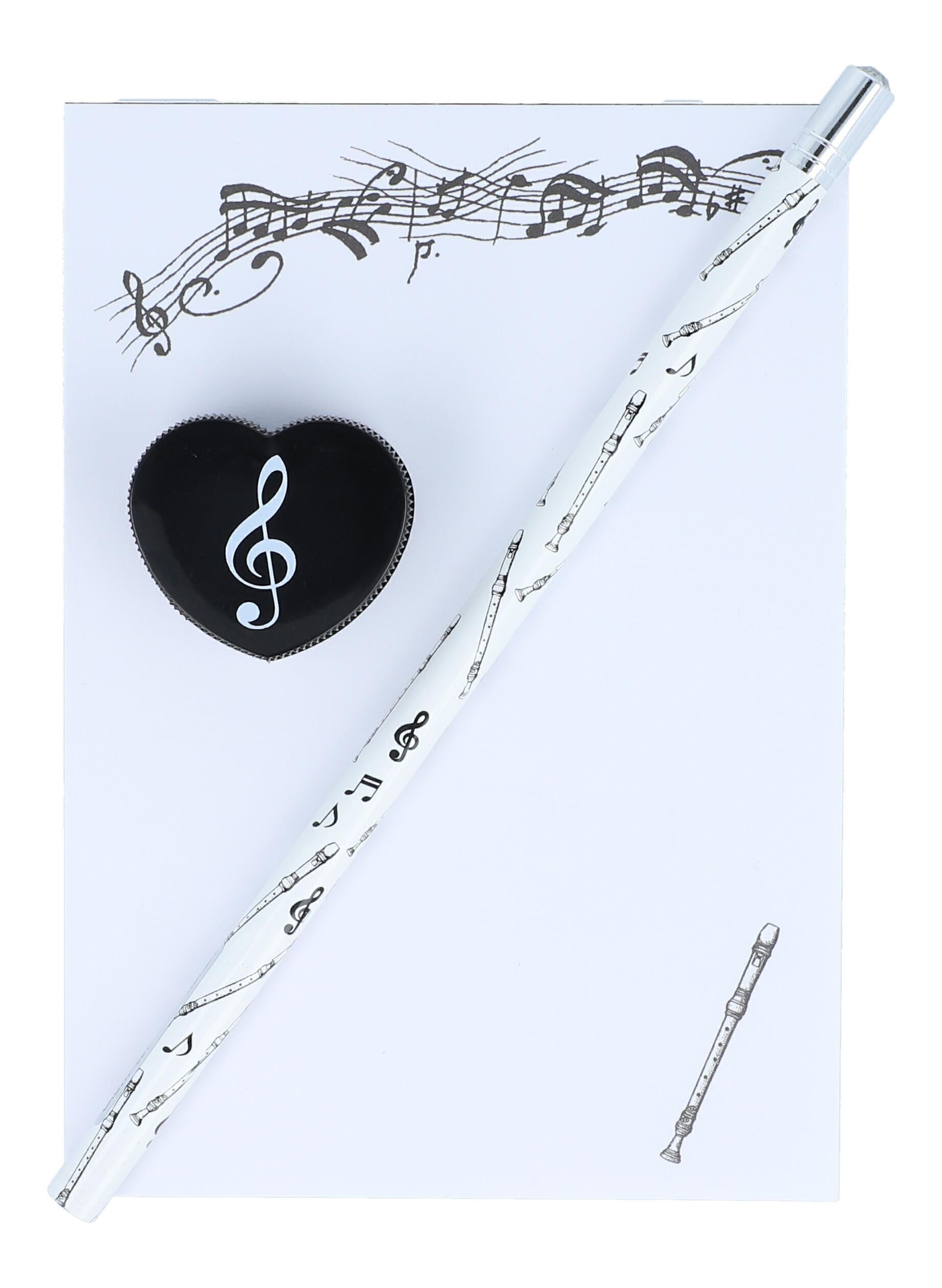 Schreibset Bleistift, Spitzer und A6-Block mit verschieden Instrumenten
