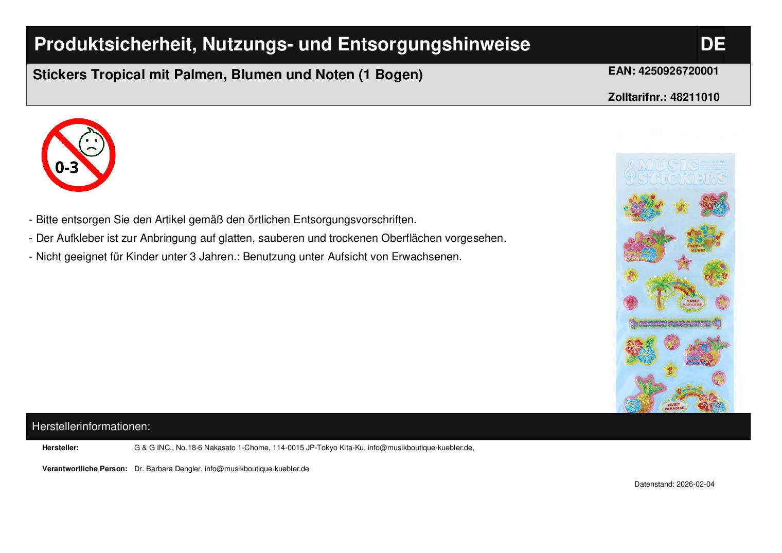 Stickers Tropical mit Palmen, Blumen und Noten (1 Bogen)