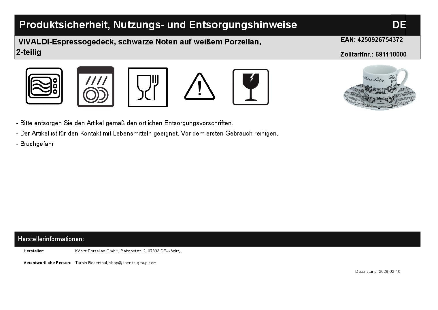 VIVALDI-Espressogedeck, schwarze Noten auf weißem Porzellan, 2-teilig