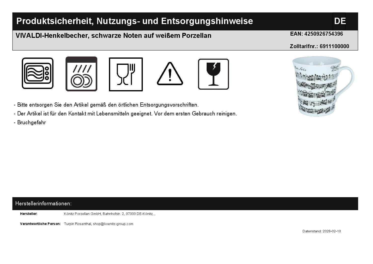 VIVALDI-Henkelbecher, schwarze Noten auf weißem Porzellan