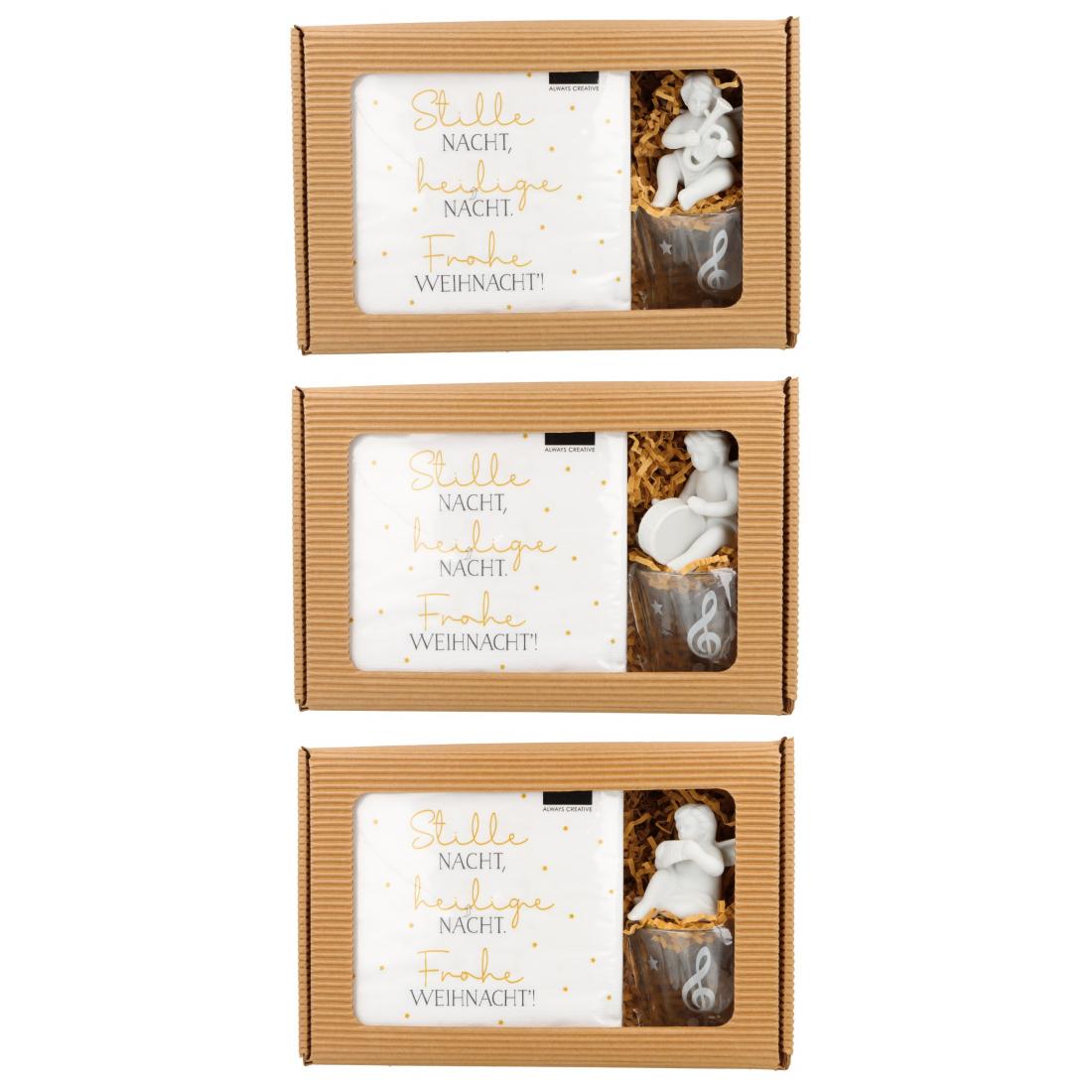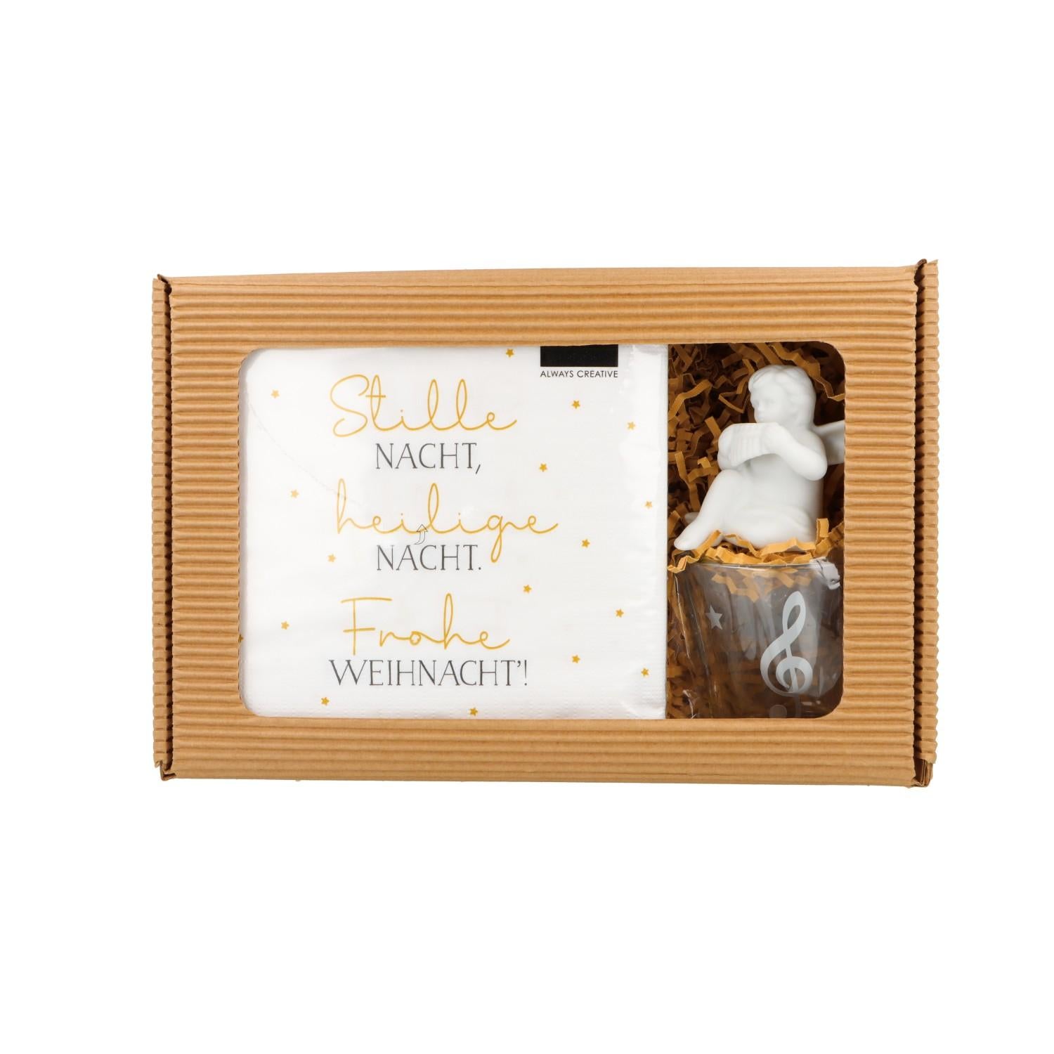 Dieses weihnachtliche Geschenkset enthält einen zauberhaften Engel, der als Dekoration oder Glücksbringer dient, sowie stilvolle Servietten für festliche Anlässe. Das Highlight des Sets ist das weihnachtliche Teelichtglas mit einem Violinschlüssel-Motiv, das perfekt für die Adventszeit geeignet ist.