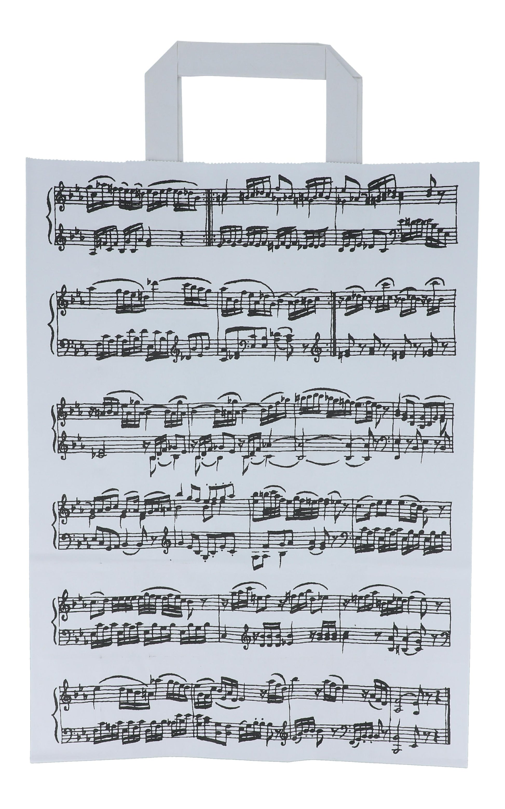 weiße Papiertragetaschen mit schwarzen Notenlinien, beidseitig bedruckt