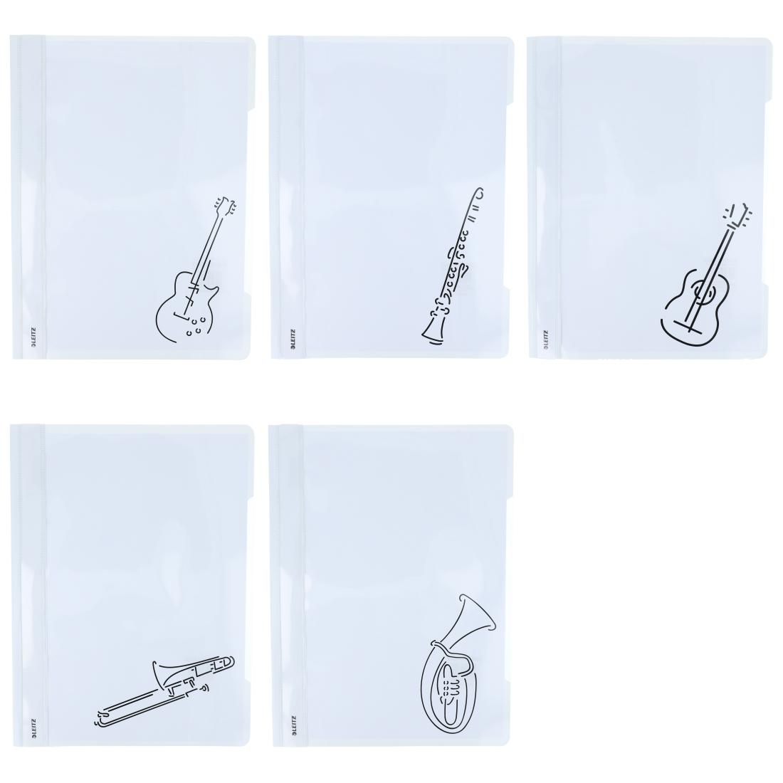 weiße Schnellhefter mit verschiedenen Instrumenten und Notenschlüsseln, für DIN A4